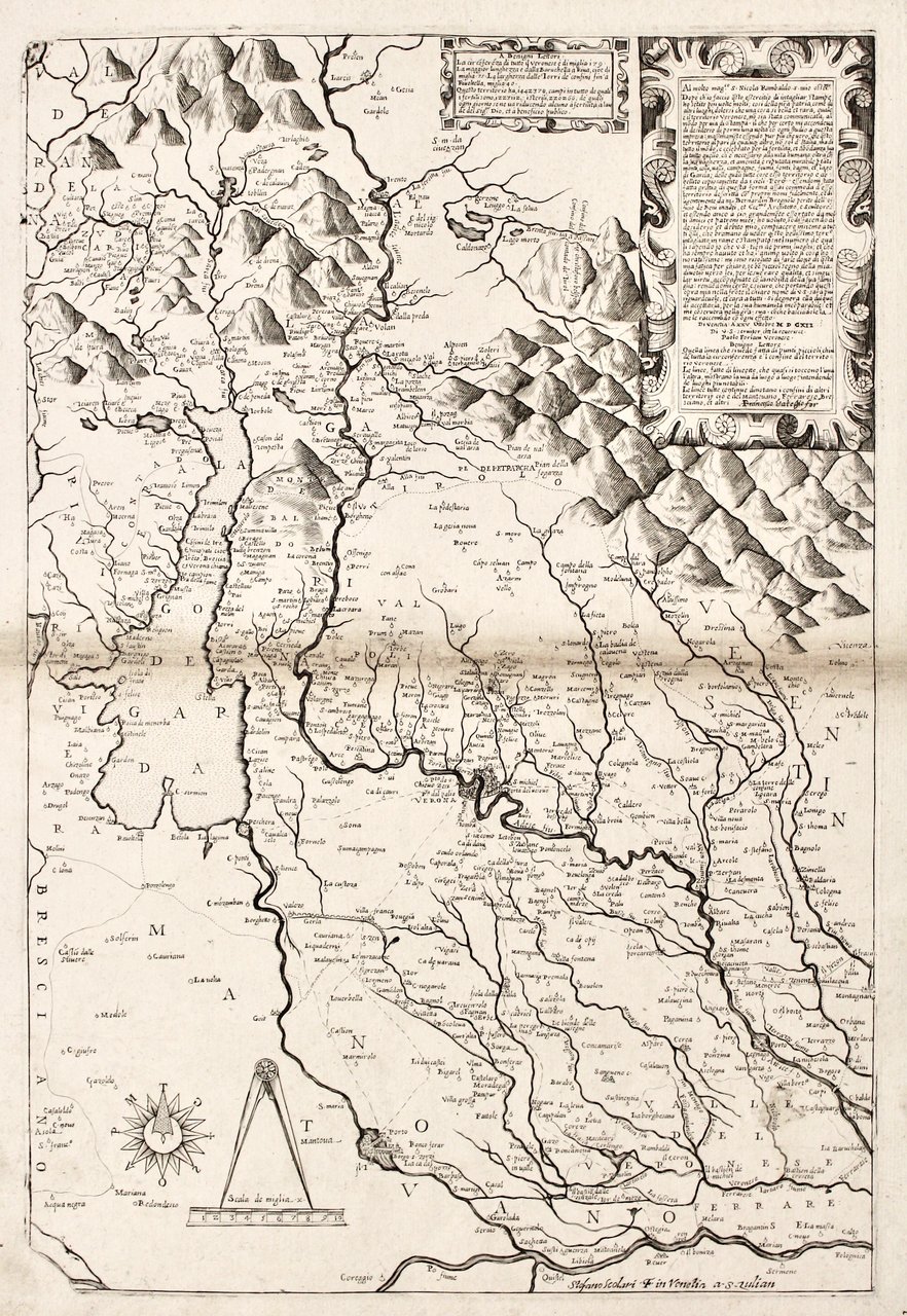 Acquaforte e bulino, mm 515x350. Impressa su carta vergata. Stato VII/VIII conosciuto solo in un'altra copia alla Newberry Library di Chicago. La PRIMA CARTA a stampa del territorio di Verona, dedicata al conte Nicola Rambaldo. Carta corografica del territorio veronese eseguita da Paolo Forlani veronese, editore ed incisore attivo a Venezia, che si sottoscrive nella dedica, derivata da un modello di Bernardino Brugnoli a cui attinse poi anche Abraham Ortelius per la carta del veronese del 1578 inserita nel suo celebre atlante "Theatrum Orbis Terrarum". Forlani nella dedica spiega i motivi che lo spinsero a realizzare la sua pubblicazione: "Dopo ch'io faccio questo esercizio di intagliar stampe ho sentito più volte molti…dolersi che una cosa si bella et rara, quale è il territorio veronese, non sia stato comunicata al mondo per via di una stampa. Il che per certo mi accendeva di desiderio di pormi una volta con ogni studio a questa impresa. Però essendomi stata fatta gratia di questa forma assai comoda d'esso territorio descritta co' propri nomi fedelmente et diligentemente da M. Bernardin Brognolo perito de' Beni Inculti…ho voluto soddisfacendo al desiderio et debito mio…vedere questo bellissimo territorio intagliato in rame e stampato" <BR>Brugnoli o Brugnolo fu architetto e perito dei Beni Inculti, prima di passare nel 1580 al servizio dei Gonzaga; si rese autore di una serie di accurati rilievi del Veronese basandosi per la parte occidentale sulla carta del Bresciano di Cristoforo Sorte, mentre per il resto del territorio presumibilmente si servì di documenti manoscritti, che aveva potuto esaminare grazie alla sua carica. Della carta esistono ben 8 differenti stati a partire dalla prima stesura del 25 ottobre 1574; fu poi stampata con modifiche di data e di indirizzi editoriali da Pinargenti (stato II), Andrea Bertelli (III), Valegio (IV), con data 1596 (V), con data 1612 (VI), Scolari 1612 (VII) e Lovisa con data 1700 (VIII). <BR>Bell'esemplare marginoso con tracce di sporco ed una piccola escoriazione alla piega centrale.<BR>Almagià (1929), p. 37-38; Tooley (1939), 593; Woodward (1990), 97; Lago (1994), p. 261; Meurer (1991), p. 120-121; Perini (1996), p. 72-73; Bifolco-Ronca, Cartografia e topografia italiana del XVI secolo, 967.<BR><BR>