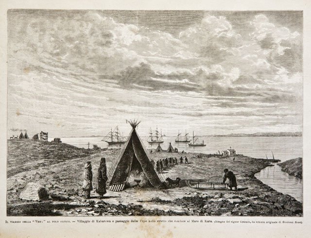 Il viaggio della “Vega” al polo artico / Villaggio di Kabarowa e passaggio della Vega nello stretto che conduce al Mare di Kara