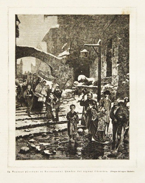 Stampa antica ed originale raffigurante la piccola folla che accompagna il prete che porta il viatico, lungo le strade di un paesino della Basilicata. Da "Il Viatico" quadro di Giacomo di Chirico. Testo al retro