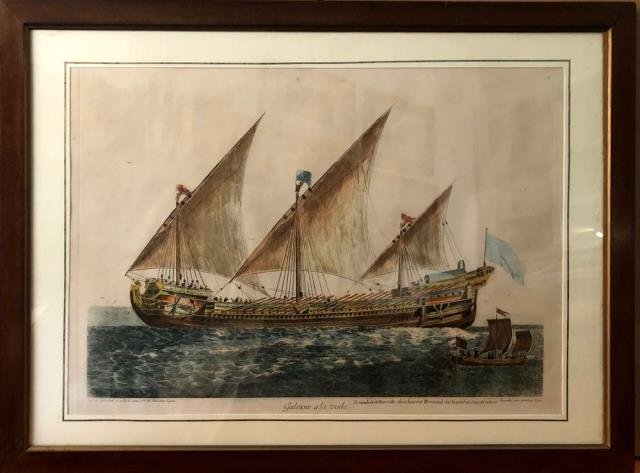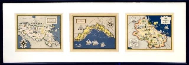 Tre cartine tratte da "Imago Italiae", il sontuoso ed elegante atlante d’Italia compilato da Giovanni de Agostini, uscito a Milano nel 1941 e edito in sole 999 copie numerate. L'atlante fu corredato dall’interessante testo in due colori di G. Lang, che descriveva le regioni della penisola con la tipica enfasi caratteristica di quegli anni, e da 19 mappe che furono opera dell’illustratore, pittore e scenografo russo, naturalizzato italiano, Vsevolod Petrovič Nikulin (Nicouline), il quale illustrò i territori con un innovativo gusto geo - pittorico, disegnando le città principali e le varie aree con i loro edifici più rappresentativi, e arricchendole con personaggi in abiti tipici, punti di interesse, peculiarità agricole, commerciali e turistiche. Tutte le carte presentano alcuni abbellimenti stilistici, come grandi rose dei venti, a indicare l’orientamento geografico, decorativi velieri nei mari e grandi cartigli con i titoli. L’apparato decorativo è infine completato dalla finitura dei bordi a filo oro a sottolineare l’importanza editoriale dell'opera. Le nostre cartine sono state rifilate e inserite in un passepartout a tre finestre che ne esalta la parte centrale e le rende elemento decorativo e di arredo. La misura dell'insieme è di cm 34 x 101 (alla luce della cornice), cornice laccata blu scuro. Più tenui gli azzurri delle prime due cartine, più intenso quello della terza, ottima conservazione dei tre fogli presentati; una mancanza dello smalto sul lato inferiore della cornice, buona conservazione. .