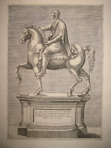 Incisione originale su rame (cm. 23,5x33 più ampi margini bianchi). Carta vergellata con filigrana. Esemplare in ottimo stato di conservazione. In basso a destra monogramma AV (Nicolas Van Aelst?). Rubach, n. 310. Raffigurazione della statua equestre in bronzo dell’Imperatore Marco Aurelio posta in Campidoglio.Antoine Lafrery (Antonio Lafreri nella forma italianizzata), incisore, editore e mercante di stampe curò la pubblicazione tra il 1544 ed il 1575 di una serie di circa 200 incisioni - raffiguranti perlopiù monumenti ed antichità romane ed opera di diversi autori - nota come ‘Speculum Romanae Magnificentiae’. Le stampe erano poste in vendita sia singolarmente che sotto forma di raccolta con un numero spesso variabile di fogli. Dal 1574 iniziò a circolare anche una tavola-frontespizio dello ‘Speculum’, attribuita a Etienne Duperac. Successivamente, tra il tardo Cinquecento ed il Settecento, i rami lafreriani conobbero tirature posteriori con l’imprint di vari editori ed il contributo di diversi incisori. Inoltre lo ‘Speculum’ fu ampliato nel tempo mediante l’aggiunta di altre tavole il cui minimo comune denominatore appare quello di riprodurre opere antiche e moderne di Roma.