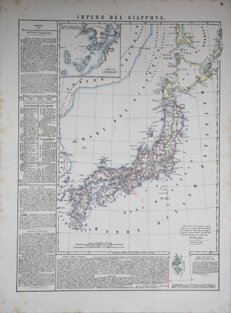 Carta geografica tratta dall’ Atlante geografico. Corredato di notizie relative alla geografia fisica politica, ed in generale alla statistica delle varie regioni del Globo. Compilato ed eseguito in litografia per cura e sotto la direzione di Benedetto Marzolla edito a Napoli nel 1858. Marzolla, autore di importanti atlanti sulle provincie del Regno di Napoli, è anche autore di diverse carte sulle ' Circoscrizioni Ecclesiastiche nel Regno delle Due Sicilie, pubblicate postume, nello stesso anno della morte (1858) a Napoli nello Stabilimento Geografico diretto da Luigi Manzella. Benedetto Marzolla fu disegnatore topografo e litografo; geografo e cartografo; membro della Commissione di statistica presso il Ministero dell'Interno. Personaggio di grandissimo rilievo nella cartografia napoletana ed italiana del XIX secolo, Marzolla ottenne in vita pubblici riconoscimenti ed attestati per la produzione cartografica di altissima qualità. La sua notorietà si è lentamente dissolta dopo la morte; va tuttavia osservato che solo la mancanza di uno spiccato coinvolgimento politico in senso risorgimentale e di una valenza letteraria nella sua opera non lo hanno reso famoso come i contemporanei Francesco Costantino Marmocchi (1805-1858) e Attilio Zuccagni-Orlandini (1783-1872), con i quali può certamente confrontarsi. I progetti culturali didattici e editoriali di Marzolla furono e rimangono di straordinaria modernità; egli inventò, è il caso di dire, un nuovo modo di intendere e di disegnare la carta geografica, fornendo una visione assolutamente originale della comunicazione dei dati geografici attraverso la combinazione di testo e immagine. Con tale operazione, egli riuscì a fondere in un'unica opera, storia, geografia, economia, statistica e cartografia, raggiungendo un equilibrio grafico di rara efficacia (cfr. V. Valerio, ' Benedetto Marzolla Brindisino, Geografo e Cartografo dell'800 Europeo, Brindisi 2008). Bell’esemplare con coloritura coeva dei contorni, in ottimo stato di conservazione. Bibliografia V. Valerio, ' Benedetto Marzolla Brindisino, Geografo e Cartografo dell’800 Europeo ' (2008), p. 62, n. 87. An interesting and uncommon detailed and large-scale Italian map of Japan published in Naples in Benedetto Marzolla's Atlante Geographico . Inset: Porto di Nangasaki (scale ca. 1:115,000). Includes notes and statistical tables. With extensive notes in the left and bottom part, listing his cartographic sources and giving political and statistical information on the area.Including the islands of "Argonaut" and Dagelet". In lower right the islands of "Mounin-sima or Bonin-sima". A group of islands discovered by Beechey in June 1827. Map taken from the Atlante geografico. Corredato di notizie relative alla geografia fisica politica, ed in generale alla statistica delle varie regioni del Globo. Compilato ed eseguito in litografia per cura e sotto la direzione di Benedetto Marzolla published in Naples in 1858. Marzolla, author of important atlases on the provinces of the Kingdom of Naples, is also the author of several maps on the Ecclesiastical Circumscriptions in the Kingdom of the Two Sicilies, published posthumously in the same year of his death (1858) in Naples in the Stabilimento Geografico directed by Luigi Manzella. Benedetto Marzolla was draftsman topographer and lithographer, geographer and cartographer. Character of great importance in the Neapolitan and Italian cartography of the nineteenth century, Marzolla obtained during his life public recognition and certificates for the production of high quality cartography. His notoriety slowly faded after his death; it should be noted, however, that only the lack of a strong political involvement in the sense of the Risorgimento and of a literary value in his work did not make him as famous as his contemporaries Francesco Costantino Marmocchi (1805-1858) and Attilio Zuccagni-Orlandini (1783-1872), with whom he can certainly compare himself. Marzolla's cultural, didactic and editorial projects were, and remain, extraordinarily modern; he invented a new way of understanding and drawing maps, providing an absolutely original vision of the communication of geographical data through the combination of text and image. With this operation, he was able to merge in a single work, history, geography, economics, statistics and cartography, achieving a graphic balance of rare effectiveness. Beautiful specimen with contemporary coloring of the contours, in excellent condition. Bibliografia V. Valerio, ' Benedetto Marzolla Brindisino, Geografo e Cartografo dell’800 Europeo ' (2008), p. 62, n. 87. Cfr.