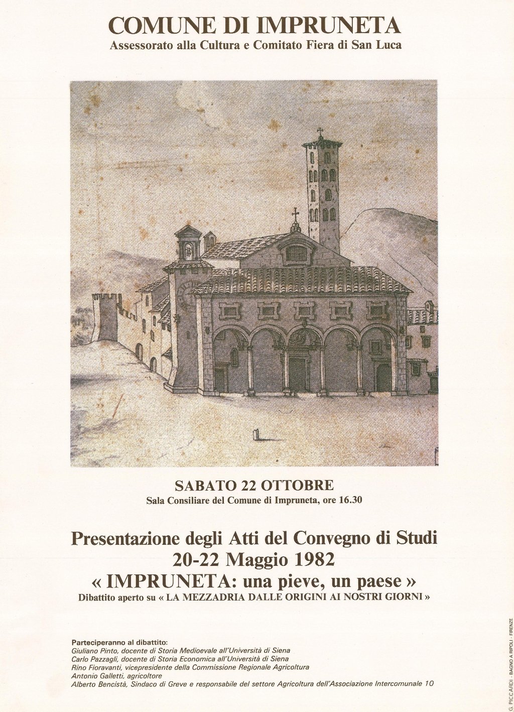 Manifesto originale. Presentazione degli Atti del Convegno di Studi, 20-22 maggio 1982, dibattito aperto su "La mezzadria dalle origini ai nostri giorni". Partecipanti: Giuliano Pinto, Carlo Pazzagli, Rino Fioravanti, Antonio Galletti, Alberto Bencistà. Impercettibile segno del tempo
