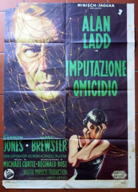 Manifesto in offset, cm 94 x 133,5. Prima originale edizione del 1959. Raro. "Imputazione omicidio" ("The Man in the Net") è un film noir del 1959 diretto da Michael Curtiz e interpretato da Alan Ladd e Carolyn Jones. Il film è tratto dal romanzo "The Man in the Net", scritto nel 1956 da Patrick Quentin (pseudonimo di Hugh Callingham Wheeler) e stampato in Italia l'anno successivo con il numero 438 nella collana "Il Giallo Mondadori", con il titolo "Il limite del furore". Alla fine del 1957, un anno dopo la pubblicazione del romanzo, la Mirisch Corporation decise di acquistarne i diritti per la realizzazione di una pellicola cinematografica. La compagnia fondata da Walter Mirisch, che produceva i film distribuiti dalla United Artists, affidò la direzione del film a Michael Curtiz mentre per la sceneggiatura fu ingaggiato Reginald Rose, che con la Mirisch aveva recentemente collaborato. Lavoro di ordinaria amministrazione che poco aggiunge alla lunga e ottima carriera di Michael Curtiz. Il tema dell'innocente in fuga per discolparsi, all'epoca piuttosto in voga, aveva dato altrove frutti migliori. Invece, qui convincono maggiormente le premesse iniziali rispetto allo scioglimento del giallo. Dignitosa ma tutto sommato senza impeti l'interpretazione di Ladd (anche lui ormai in fase discendente), meglio la perfida Jones (futura Morticia della Famiglia Addams) e la comprensiva Brewster, bravi i bambini. Mancanti il margine bianco superiore e il laterale sinistro, pieghe di chiusura del foglio, nell'insieme in buone condizioni. .