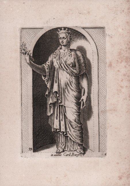 La statua, nella collezione della Galleria Borghese, rappresenta una figura femminile veste una lunga tunica sulla quale è adagiato il mantello, l’himation, avvolto intorno al corpo in un doppio giro. Il panneggio, caratterizzato da un risvolto obliquo trattenuto sulla spalla destra che ricade in fitte pieghe verticali dall’alto rilievo, rievoca modelli arcaici del V secolo a.C. Tale iconografia si ritrova comunemente impiegata nella scultura romana per la raffigurazione delle sacerdotesse di Iside. ' Proveniente dalla Collezione Ceoli, venduta nel 1607 alla famiglia Borghese, la scultura è restaurata nel 1828 dallo scultore Giuseppe Boschi, il quale aggiunge gli elementi in metallo, caratteristici della dea Iside: il fiore di loto sul capo, il sistro nella mano destra e la situla, una brocca, in quella sinistra. Esposta nel 1832 nella sala VII, la statua è da inquadrare, in base alle osservazioni stilistiche, nella prima età imperiale. Bulino, circa 1599, della serie ' ANTIQUARUM STATUARUM URBIS ROMAE LIBER PRIMUS, ideata, incisa e stampata a Roma da Philippe Thomassin. Esemplare nel primo stato di due. Philippe Thomassin fu incisore e editore, nativo di Troyes, attivo a Roma a partire dal 1585. Nel 1588 iniziò a pubblicare le sue opere. Nel 1589 iniziò la collaborazione con Jean Turpin; la loro società venne descritta nell’atto di scioglimento del 19 gennaio 1602 come devota alla ‘pratica della pittura e incisione, per l’acquisto e la vendita di incisioni stampate da loro o per loro ordine, per vendita all’estero al dettaglio e all’ingrosso.’. Nel 1590 fu arrestato e interrogato dal Santo Ufficio per un ritratto - che avrebbe inciso - di Enrico IV di Francia. Nei suoi primi anni a Roma lavorò per editori come Claudio Duchetti, Lorenzo Vaccari e Marcello Clodio. Comprò vecchie lastre, anche un gruppo dagli eredi di Aliprando Caprioli nel 1599 per il quale richiese un privilegio di 10 anni a Papa Clemente VIII nello stesso anno. Nel1603 pubblicò due incisioni di Francesco Villamena. Baglione disse che amava concentrarsi di più su soggetti religiosi, ma non in maniera esclusiva, come mostra l’importante collezione ' Antiquarum Statuarum Urbis Romae. Bellissima prova, impressa su carta vergata coeva, con margini, minime ossidazioni, per il resto in ottimo stato di conservazione. Bibliografia E. Bruwaert, ' La vie et les oeuvres de Philippe Thomassin Graveur Troyen ' (1562-1622), 1914, n. 275; The De Rossi family, 497, 534, 1993; Indice delle stampe De Rossi, 17, c. 6, 1735; Indice delle stampe De Rossi, 12, c. 2, 1677; ' L’Antiquarum Statuarum Urbis Romae fra antichità e collezionismo, in “Bollettino d'Arte” volume speciale VI serie 1995. This statue, in the Galleria Borghese, represents a female figure wearing a long tunic beneath a mantel, called a himation, that is wrapped twice around the body. The drapery, which is pulled diagonally across the body and held at the shoulder, falling in dense vertical folds in high relief, is reminiscent of archaic models from the fifth century BCE. The iconographic type was typically used in Roman sculpture to depict priestesses of the goddess Isis. ' Coming from the Ceoli Collection, which was sold to the Borghese family in 1607, the sculpture was restored in 1828 by the sculptor Giuseppe Boschi, who added the metal components referencing the goddess Isis: the lotus flower on the figure’s head, the sistrum in her right hand and the situla, a kind of pitcher, in her left. Displayed in Room VII in 1832, the statue can be dated to the early imperial period, based on stylistic analysis. Engraving, circa 1599, from the series ' ANTIQUARUM STATUARUM URBIS ROMAE LIBER PRIMUS, designed, engraved, and printed in Rome by Philippe Thomassin. Example in the first state of two. Philippe Thomassin was an engraver and publisher, a native of Troyes, active in Rome from 1585. In 1588 he began publishing his works. In 1589 he began a partnership with Jean Turpin; their company was described in the act of dissolution of January 19, 1602 as devoted to 'the practice of painting and engraving, for the purchase and sale of engravings printed by them or by their order, for sale abroad at retail and wholesale.' In 1590 he was arrested and interrogated by the Sacro Offizio for a portrait-which he would engraved of Henry IV of France. In his early years in Rome he worked for publishers such as Claudio Duchetti, Lorenzo Vaccari and Marcello Clodio. He bought old plates, even a group from the heirs of Aliprando Caprioli in 1599 for which he requested a 10-year privilege from Pope Clement VIII in the same year. In 1603 he published two engravings by Francesco Villamena. Baglione said he liked to focus more on religious subjects, but not exclusively, as the important collection ' Antiquarum Statuarum Urbis Romae ' shows. Beautiful proof, printed on contemporary laid paper, with margins, minimal oxidation, otherwise in excellent condition. Bibliografia E. Bruwaert, ' La vie et les oeuvres de Philippe Thomassin Graveur Troyen ' (1562-1622), 1914, n. 275; The De Rossi family, 497, 534, 1993; Indice delle stampe De Rossi, 17, c. 6, 1735; Indice delle stampe De Rossi, 12, c. 2, 1677; ' L’Antiquarum Statuarum Urbis Romae fra antichità e collezionismo, in “Bollettino d'Arte” volume speciale VI serie 1995. Cfr.