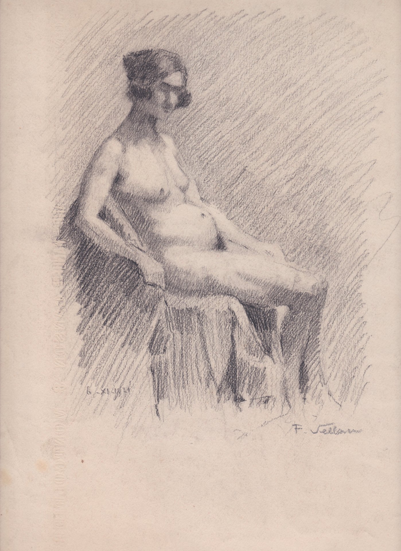 Ritratto intimo e pudico di una giovane donna nuda che mostra evidente il segno della gravidanza, esaltato dalla luce che proviene dall'alto. Il segno corto e deciso, fitto o distanziato, più volte ripassato per creare il chiaroscuro, rivela i modi dello stile Liberty. Firma a matita in basso a destra: F. Vellan. A sinistra: 6-XI-1921. Al verso frammento di disegno raffigurante busto femminile (?).