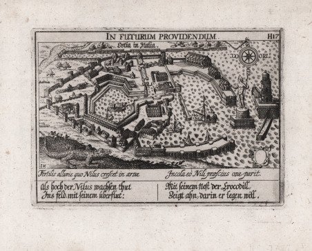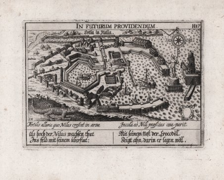 Veduta tratta dall'edizione del 1678 della celebre ' Sciagraphia Cosmica ' nota anche con il titolo ' Das ist Newes Emblematisches Buechlei, dainen in acht Centurijs die vornembste Stat, Vestung, Schlosser der ganzen Welt. ' stampata a Norinberga. La ' Sciagraphia Cosmica, venne ampliata sotto la supervisione di Kieser dopo la morte di Meisner nel 1625, arrivando quindi ad una composizione di 800 magnifiche incisioni. ' Ogni opera è caratterizzata da un motto sopra l'immagine, e da versi emblematici (in latino o tedesco). L'opera è la combinazione di due generi allora popolari, il libro degli stemmi e il "Teatro delle città". Tra i maestri incisori e miniatori che contribuirono a questa serie ci sono Matthäus Merian, Sebastian Furck, Christian Stimmer e forse anche Meisner stesso, che concepì l'opera e contribuì a buona parte della prosa. ' Incisione in rame, con margini, in perfetto stato di conservazione. View taken from the 1678 edition of the famous ' Sciagraphia Cosmica ' also known with the full title ' Sciagraphia Cosmica: ' Das ist Newes Emblematisches Buechlei, dainen in acht Centurijs die vornembste Stat, Vestung, Schlosser der ganzen Welt. printed in Nuremberg. The ' Sciagraphia Cosmica, was expanded under the supervision of Kieser after the death of Meisner in 1625, thus arriving at a composition of 800 magnificent engravings. ' Each engraving is characterized by a motto above the image, and by emblematic verses (in Latin or German). The work is a combination of two then-popular genres, the book of coats of arms and the "Town Book". Among the master engravers and illuminators who contributed to this series are Matthäus Merian, Sebastian Furck, Christian Stimmer, and perhaps Meisner himself, who conceived the work and contributed much of the prose. ' Copperplate engraving, with margins, in perfect condition. Cfr. Cremonini pagg. 57/58, 45a.