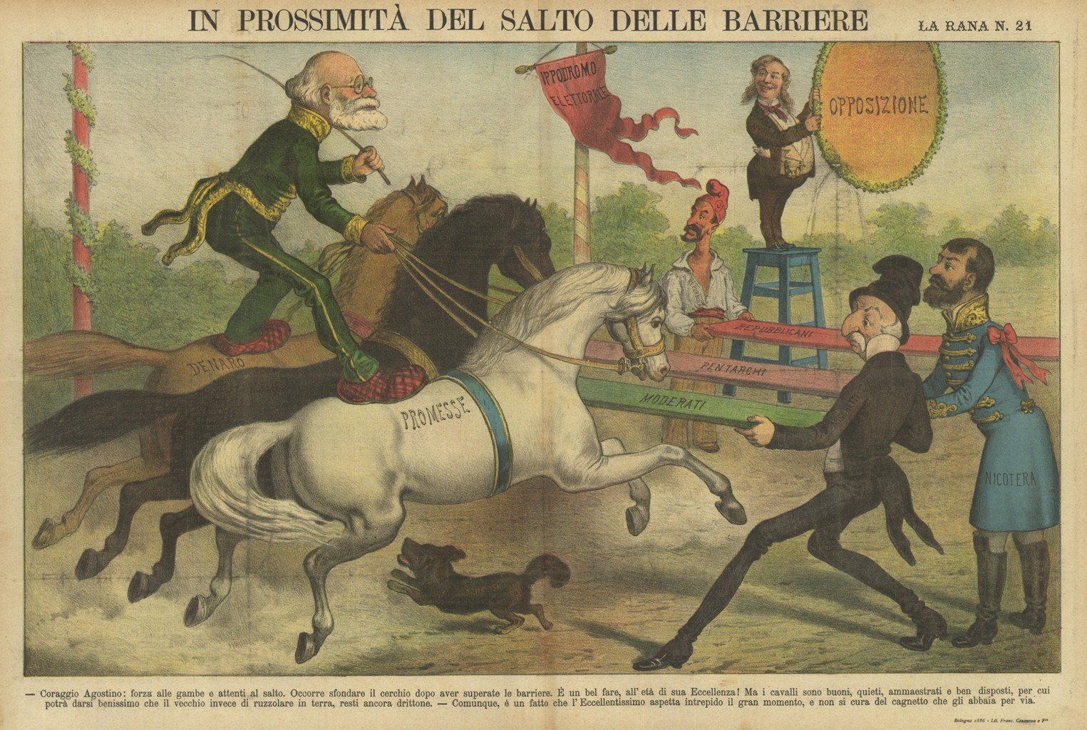 Litografia, antica ed originale, stampata a colori, tratta dal ricercato e raro giornale umoristico settimanale LA RANA, fondato e pubblicato a Bologna nel novembre 1865 da Leonida Gioannetti e da Augusto Grossi. Fu un giornale di grande successo per le sue satiriche caricature a colori di cui alcune in qudruplo foglio che fu uno dei successi editoriali. I politici, lo Stato Ecclesiastico e la politica europea furono i prediletti ispiratori. Il periodico affrontò una grave crisi nel 1873, quando Grossi decise di abbandonare la redazione per fondare Il Papagallo. La Rana sospese le pubblicazioni nel 1911, per cessarle definitivamente nel 1912. Numero 21 pubblicato venerdi 21 maggio 1886. La scena rappresenta l'ippodromo elettorale con le sue promesse