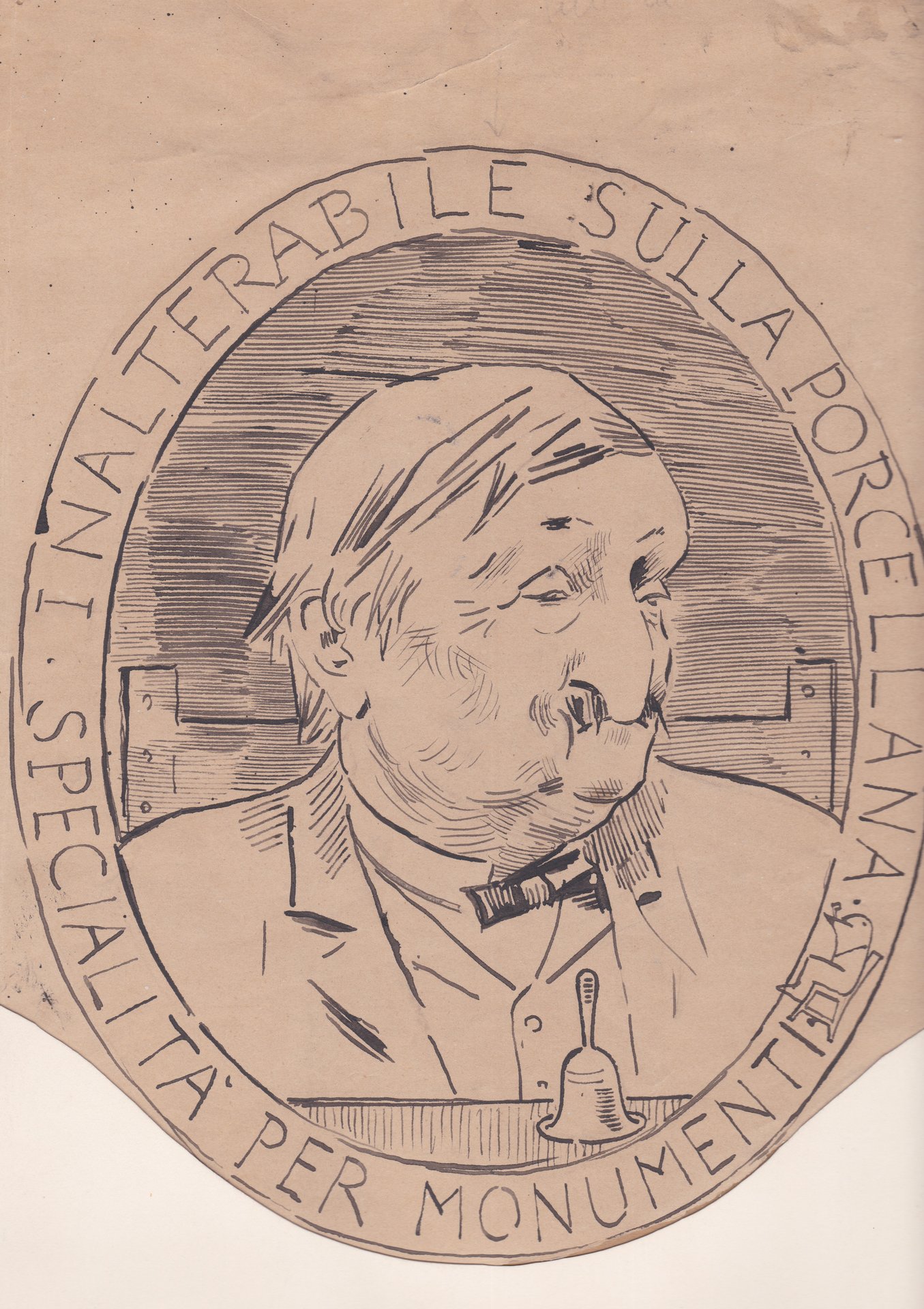 Nel foglio Conconi realizza un ritratto caricaturale a mezzo busto del II sindaco di Milano Giulio Bellinzaghi (1873-1892). Il sindaco seduto è raffigurato tramite poche linee, parallele e nette, all'interno di un ovale sul quale si legge: Inalterabile sulla porcellana. Specialità per monumenti. Tra le due frasi il profilo di una figura seduta con un elmo in testa simile alla figura di Guerrin Meschino sul frontespizio dell'omonimo giornale satirico milanese. Davanti all'uomo un piano sul quale si vede un campanello, probabilmente utilizzato per richiamare all'ordine nelle sedute del consiglio comunale. Le parole sono probabilmente un riferimento al fatto che Bellinzaghi è il sindaco rimasto in carica per il tempo più lungo, quasi diciannove anni, di cui sedici consecutivi. Opera eseguita su carta leggera poi parzialmente applicata a cartoncino color avorio scuro sul quale si legge il riferimento al sindaco. Mancanze al margine bianco inferiore che non interessano il soggetto. Il disegno è accompagnato da autentica su foto della figlia di Conconi.