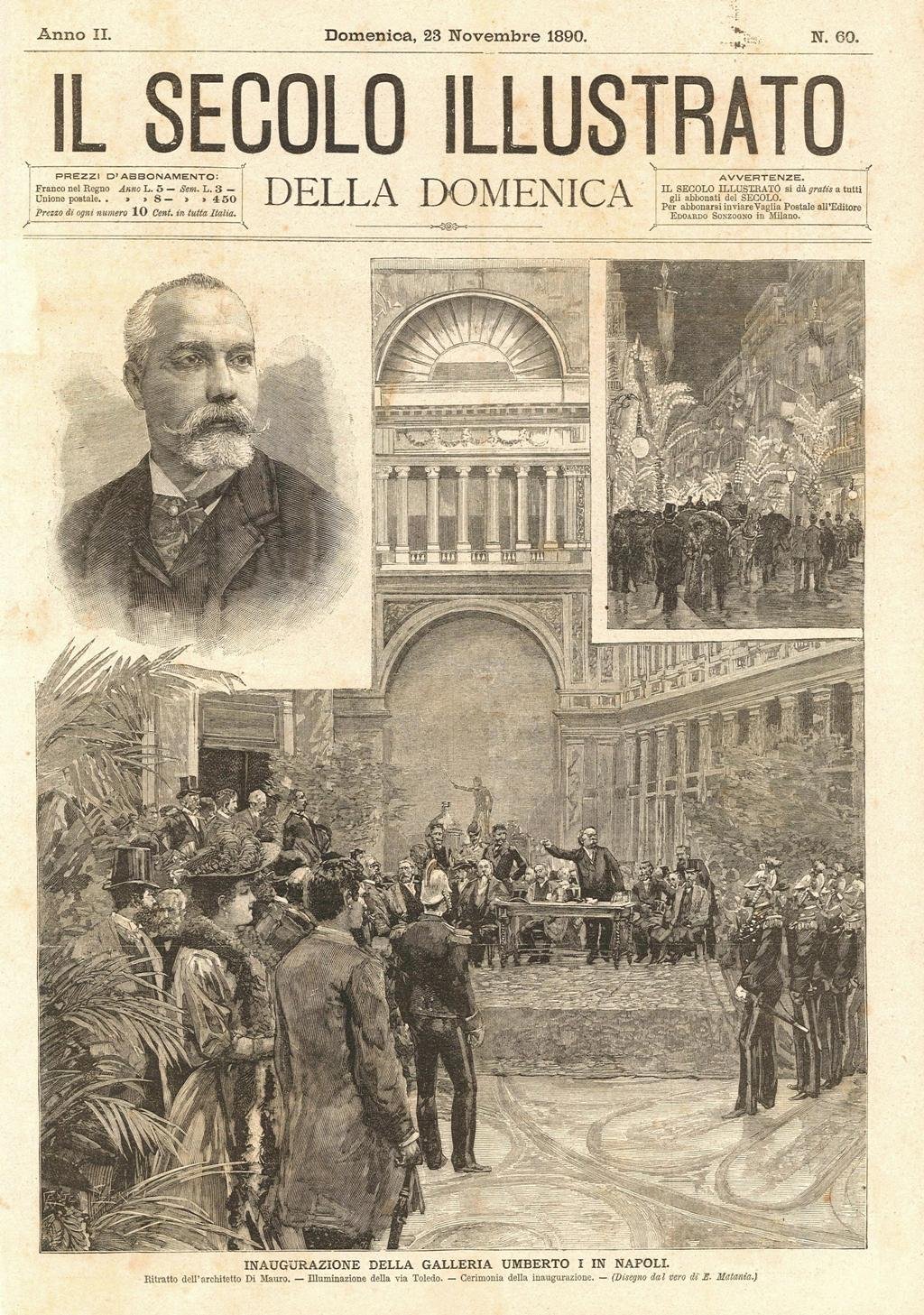 Stampa, antica ed originale, con raffigurazione della cerimonia d'inaugurazione della galleria e ritratto dell'architetto Di Mauro. Autore: Centenari. Luogo: Napoli. Anno: 1890. Tecnica: xilografia. Dimensioni: 296x248. Testo al verso