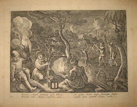 Incisione originale su rame (cm. 26,5x20 più ampi margini) da un disegno di Jan Van Der Straet (Giovanni Stradano) tratta dall’opera ‘Venationes Ferarum, Avium, Piscium.’. Carta filigranata. Ottimo esemplare. Cfr. Baroni Vannucci, p. 371.