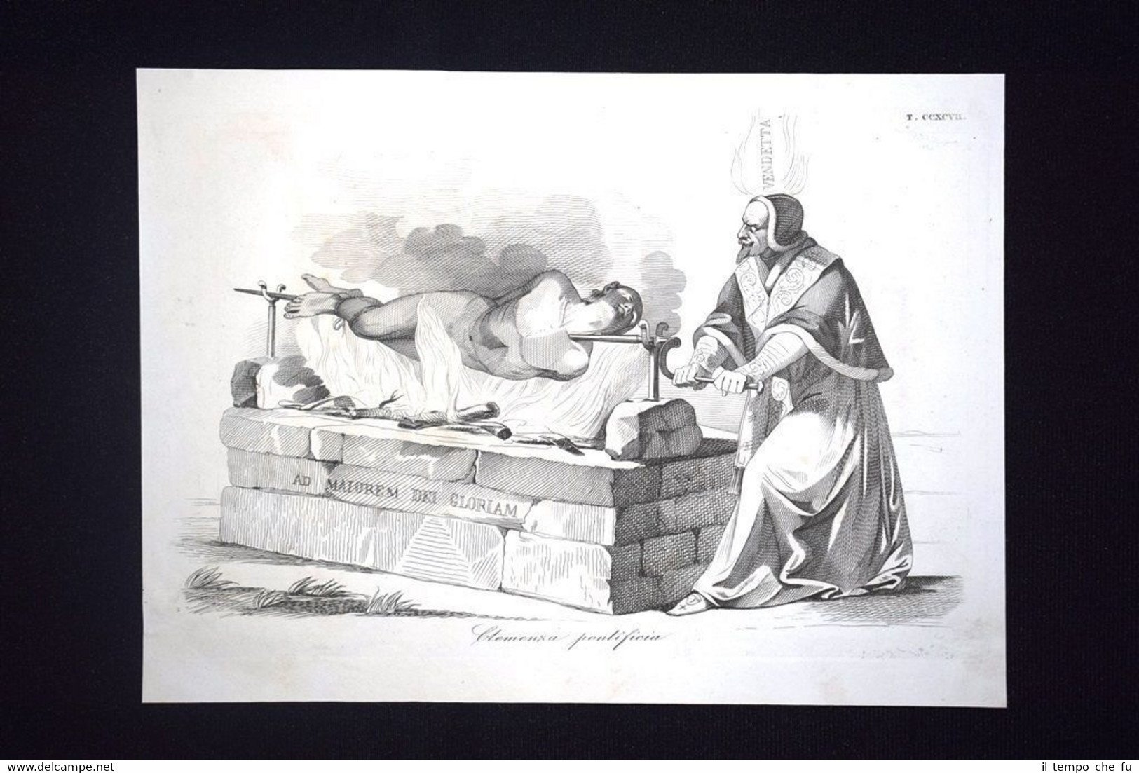Preziosa ottocentina allegorico - caricaturale Tema: Arnaldo da Brescia, l'ardito monaco che aveva sfidato gli intrighi e le ruberie dei palazzi ecclesiastici, condannato a morte per impiccagione e rogo del cadavere, sotto il papato di Adriano IV Bella e rara incisione all'acquaforte di satira pungente e dissacrante sui Moti del 1848, detti anche Rivoluzione del '48 o Primavera dei Popoli, che sconvolsero l'Italia e tutta l'Europa nel 1848 e 1849. Estratta dall'introvabile: Don Pirlone a Roma. Memorie di un Italiano dal 1°settembre 1848 al 31 dicembre 1850. Autore: Michelangelo Pinto Editore: Alessandro Fontana Anno di pubblicazione: 1851 DON PIRLONE - 023/CCXCVII Dimensioni Cm 22,00 x 16,00 Qualora vogliate delle scansioni migliori contattateci, soddisferemo ogni vostra richiesta. Contesto storico: I moti del 1848, detti anche rivoluzione del '48 o Primavera dei popoli furono un'ondata di moti rivoluzionari borghesi che sconvolsero l'Europa nel 1848 e nel 1849. Scopo dei moti fu abbattere i governi della Restaurazione per sostituirli con governi liberali. Il loro impatto storico fu così profondo e violento che nel linguaggio corrente è entrata in uso l'espressione «fare un quarantotto» per sottintendere una improvvisa confusione e scompiglio. La prima agitazione europea del 1848 si verificò in Italia: la rivoluzione siciliana che esplose il 12 gennaio di quell'anno, che rappresentò la prima miccia dell'esplosione europea. L'insurrezione siciliana, infatti, spinse in un primo momento i Borbone a concedere il ritorno nell'Isola alla costituzione del 1812. Seguì una rivoluzione a Napoli, il 27, che costrinse, due giorni dopo, Ferdinando II a promettere una Costituzione, promulgata l'11 febbraio. Lo stesso 11 febbraio Leopoldo II di Toscana, cugino primo dell'imperatore Ferdinando I d'Austria, concesse la Costituzione, nella generale approvazione dei suoi sudditi. L'esempio borbonico fu seguito da Carlo Alberto di Savoia con lo Statuto Albertino e da Papa Pio IX con lo Statuto Fondamentale. Solo il re piemontese mantenne però lo Statuto. In Sicilia il parlamento proclamò in marzo l'indipendenza, che sarebbe durata fino al maggio 1849. Nel napoletano la concessione e la successiva repressione delle libertà costituzionali, portò dal maggio al settembre di quell'anno a una serie di moti. In tutto il Regno Lombardo-Veneto scoppiarono rivolte, come le Cinque giornate di Milano che sfociarono nella prima guerra di indipendenza. Nello Stato Pontificio una rivolta interna estromise papa Pio IX dai suoi poteri temporali e portò alla costituzione della Repubblica Romana. La rivoluzione delle Cinque giornate di Milano e altre proteste indussero il Re Carlo Alberto a dichiarare guerra all'Austria. Le truppe vennero presto sconfitte e solo quelle francesi poterono far retrocedere gli austriaci. La successiva ascesa al trono di Vittorio Emanuele II fece del Piemonte il motore propulsore del processo di unificazione italiana che tuttavia si sarebbe ottenuto solo nel 1861. Per quanto i Moti del '48 furono sedati abbastanza velocemente, le vittime furono decine di migliaia: il destino della democrazia europea ci è sfuggito di mano dichiarerà Pierre-Joseph Proudhon. Gli storici concordano che la Primavera dei popoli fu, alla fin fine, soprattutto un sanguinoso fallimento, se si eccettua la concessione dello Statuto Albertino nel Regno di Sardegna da parte di Carlo Alberto di Savoia, l'unica costituzione non revocata di quelle concesse o votate nel 1848-49. Vi furono tuttavia radicali e notevoli effetti a lungo termine: Germania e Italia sarebbero presto arrivate all'unificazione facendo leva anche sulla necessità di autodeterminazione dei popoli. Analogamente l'Ungheria sarebbe giunta ad un parziale riconoscimento della propria autonomia (a discapito della popolazione slava) grazie all'Ausgleich del 1867. In Prussia e Austria fu abolito il feudalesimo, mentre in Russia fu eliminata la servitù della gleba nel 1861. Tavola allegorico - caricaturale sullo stato dell'Italia del tempo, incisione su rame ricca di significato e rappresentazione mediante satirica dissacrante della condizione della nostra penisola oppressa. Le tavole dell'opera furono in parte riprese dal giornale romano Don Pirlone, quotidiano, uscito dal 1 settembre 1848 al 2 luglio 1849 (con una interruzione dl 29 aprile al 7 maggio 1849), ma in parte furono realizzate appositamente per questa opera. Tra gli incisori sono presenti anche i nomi di Ratti, Vaiani, Monneret, Gallucci, Pichi, Masutti. Il titolo Don Pirlone deriva quasi sicuramente da una maschera creata dallo scrittore satirico Girolamo Gigli (1660 - 1722). Si trattava di una specie di Tartufo molieresco, ispirato ad una figura reale, il canonico Feliciati di Sarteano. Nei tre volumi l'avvocato Michelangiolo Pinto raccolse tutto il pubblicato del giornale, che fu il più temuto e allo stesso tempo il più apprezzato tra i molteplici giornali satirici che si pubblicavano nella Roma di Pio IX all'epoca delle