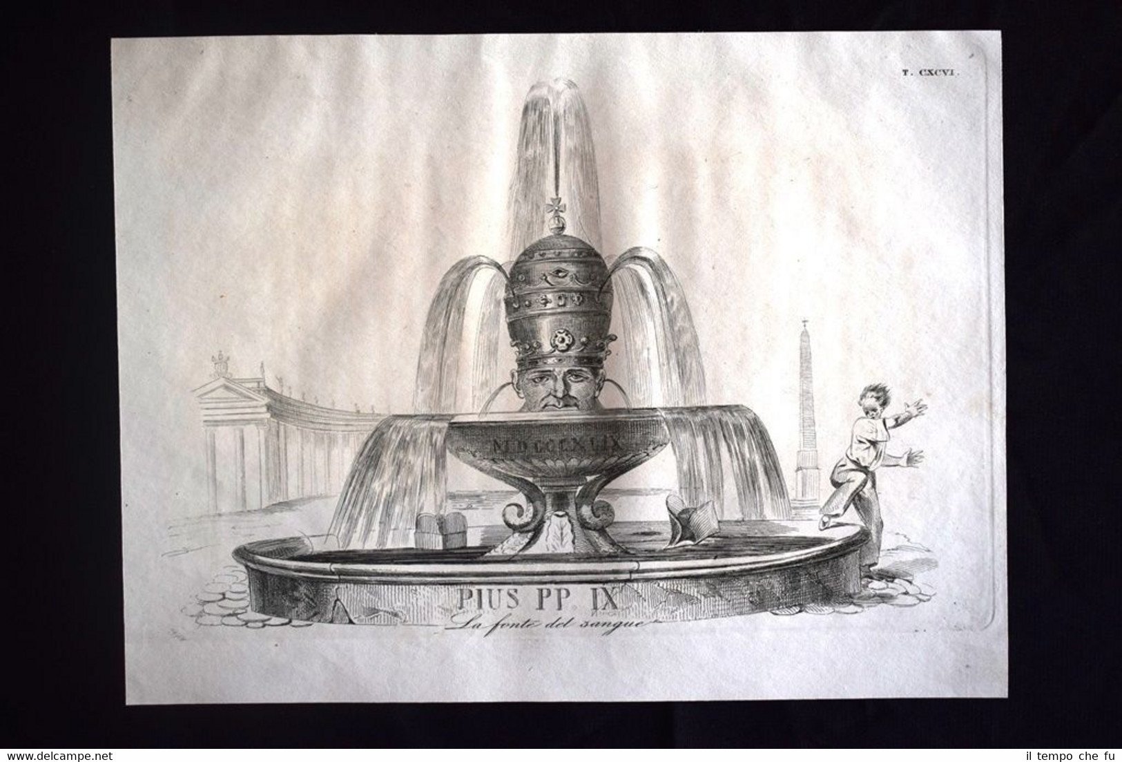 Preziosa ottocentina allegorico - caricaturale Tema: Il popolo maledice il Papato: il nome di Pio IX corre nelle bocche di tutti, col grido dell'odio, con l'accento disperato della bestemmia. Si prepara il ritorno del Papa a Roma, su un terreno che ha visto versare il sangue di fratelli per mano di fratelli Bella e rara incisione all'acquaforte di satira pungente e dissacrante sui Moti del 1848, detti anche Rivoluzione del '48 o Primavera dei Popoli, che sconvolsero l'Italia e tutta l'Europa nel 1848 e 1849. Estratta dall'introvabile: Don Pirlone a Roma. Memorie di un Italiano dal 1°settembre 1848 al 31 dicembre 1850. Autore: Michelangelo Pinto Editore: Alessandro Fontana Anno di pubblicazione: 1851 DON PIRLONE - 014/CXCVI Dimensioni Cm 22,00 x 16,00 Qualora vogliate delle scansioni migliori contattateci, soddisferemo ogni vostra richiesta. Contesto storico: I moti del 1848, detti anche rivoluzione del '48 o Primavera dei popoli furono un'ondata di moti rivoluzionari borghesi che sconvolsero l'Europa nel 1848 e nel 1849. Scopo dei moti fu abbattere i governi della Restaurazione per sostituirli con governi liberali. Il loro impatto storico fu così profondo e violento che nel linguaggio corrente è entrata in uso l'espressione «fare un quarantotto» per sottintendere una improvvisa confusione e scompiglio. La prima agitazione europea del 1848 si verificò in Italia: la rivoluzione siciliana che esplose il 12 gennaio di quell'anno, che rappresentò la prima miccia dell'esplosione europea. L'insurrezione siciliana, infatti, spinse in un primo momento i Borbone a concedere il ritorno nell'Isola alla costituzione del 1812. Seguì una rivoluzione a Napoli, il 27, che costrinse, due giorni dopo, Ferdinando II a promettere una Costituzione, promulgata l'11 febbraio. Lo stesso 11 febbraio Leopoldo II di Toscana, cugino primo dell'imperatore Ferdinando I d'Austria, concesse la Costituzione, nella generale approvazione dei suoi sudditi. L'esempio borbonico fu seguito da Carlo Alberto di Savoia con lo Statuto Albertino e da Papa Pio IX con lo Statuto Fondamentale. Solo il re piemontese mantenne però lo Statuto. In Sicilia il parlamento proclamò in marzo l'indipendenza, che sarebbe durata fino al maggio 1849. Nel napoletano la concessione e la successiva repressione delle libertà costituzionali, portò dal maggio al settembre di quell'anno a una serie di moti. In tutto il Regno Lombardo-Veneto scoppiarono rivolte, come le Cinque giornate di Milano che sfociarono nella prima guerra di indipendenza. Nello Stato Pontificio una rivolta interna estromise papa Pio IX dai suoi poteri temporali e portò alla costituzione della Repubblica Romana. La rivoluzione delle Cinque giornate di Milano e altre proteste indussero il Re Carlo Alberto a dichiarare guerra all'Austria. Le truppe vennero presto sconfitte e solo quelle francesi poterono far retrocedere gli austriaci. La successiva ascesa al trono di Vittorio Emanuele II fece del Piemonte il motore propulsore del processo di unificazione italiana che tuttavia si sarebbe ottenuto solo nel 1861. Per quanto i Moti del '48 furono sedati abbastanza velocemente, le vittime furono decine di migliaia: il destino della democrazia europea ci è sfuggito di mano dichiarerà Pierre-Joseph Proudhon. Gli storici concordano che la Primavera dei popoli fu, alla fin fine, soprattutto un sanguinoso fallimento, se si eccettua la concessione dello Statuto Albertino nel Regno di Sardegna da parte di Carlo Alberto di Savoia, l'unica costituzione non revocata di quelle concesse o votate nel 1848-49. Vi furono tuttavia radicali e notevoli effetti a lungo termine: Germania e Italia sarebbero presto arrivate all'unificazione facendo leva anche sulla necessità di autodeterminazione dei popoli. Analogamente l'Ungheria sarebbe giunta ad un parziale riconoscimento della propria autonomia (a discapito della popolazione slava) grazie all'Ausgleich del 1867. In Prussia e Austria fu abolito il feudalesimo, mentre in Russia fu eliminata la servitù della gleba nel 1861. Tavola allegorico - caricaturale sullo stato dell'Italia del tempo, incisione su rame ricca di significato e rappresentazione mediante satirica dissacrante della condizione della nostra penisola oppressa. Le tavole dell'opera furono in parte riprese dal giornale romano Don Pirlone, quotidiano, uscito dal 1 settembre 1848 al 2 luglio 1849 (con una interruzione dl 29 aprile al 7 maggio 1849), ma in parte furono realizzate appositamente per questa opera. Tra gli incisori sono presenti anche i nomi di Ratti, Vaiani, Monneret, Gallucci, Pichi, Masutti. Il titolo Don Pirlone deriva quasi sicuramente da una maschera creata dallo scrittore satirico Girolamo Gigli (1660 - 1722). Si trattava di una specie di Tartufo molieresco, ispirato ad una figura reale, il canonico Feliciati di Sarteano. Nei tre volumi l'avvocato Michelangiolo Pinto raccolse tutto il pubblicato del giornale, che fu il più temuto e allo stesso tempo il più apprezzato tra i molteplici giornali satir