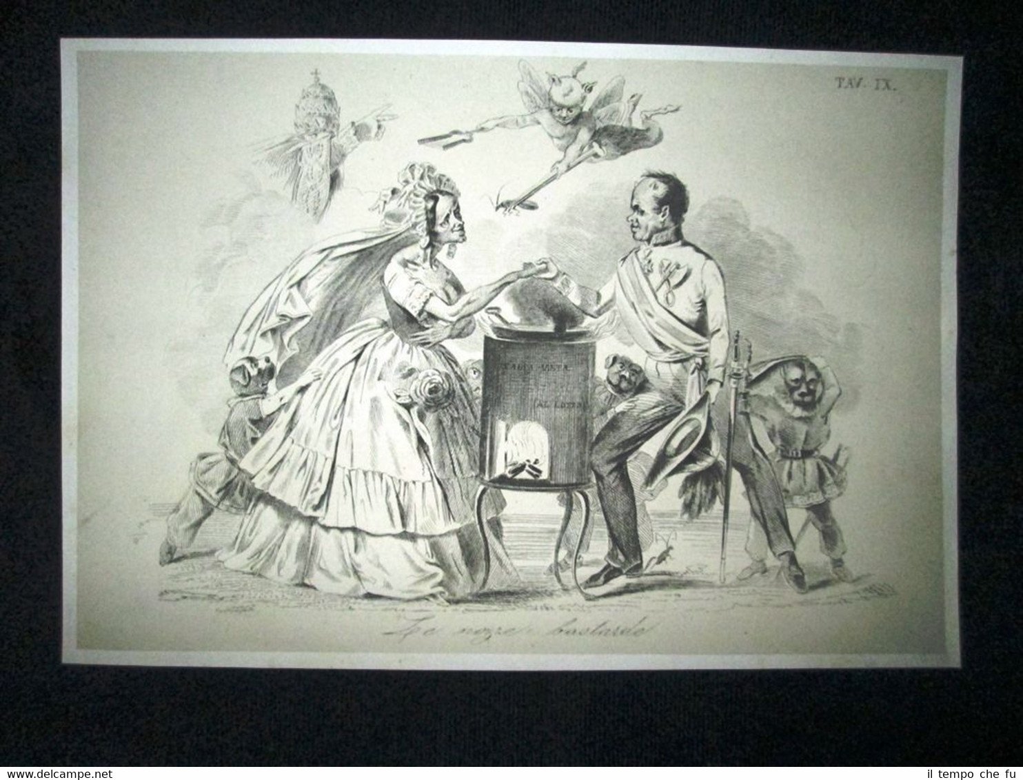 Preziosa ottocentina allegorico - caricaturale Tema: Il Generale Radetzky, non contento delle rapine perpetrate alle ricche città lombarde e venete, sposa Giuditta Meregalli di Milano, notissima concubina già madre per lui di quattro figli bastardi. In mezzo a loro brucia nel calderone l'Italia vinta Bella e rara incisione all'acquaforte di satira pungente e dissacrante sui Moti del 1848, detti anche Rivoluzione del '48 o Primavera dei Popoli, che sconvolsero l'Italia e tutta l'Europa nel 1848 e 1849. Estratta dall'introvabile: Don Pirlone a Roma. Memorie di un Italiano dal 1°settembre 1848 al 31 dicembre 1850. Autore: Michelangelo Pinto Editore: Alessandro Fontana Anno di pubblicazione: 1851 DON PIRLONE - 001/IX Dimensioni Cm 22,00 x 16,00 Qualora vogliate delle scansioni migliori contattateci, soddisferemo ogni vostra richiesta. Contesto storico: I moti del 1848, detti anche rivoluzione del '48 o Primavera dei popoli furono un'ondata di moti rivoluzionari borghesi che sconvolsero l'Europa nel 1848 e nel 1849. Scopo dei moti fu abbattere i governi della Restaurazione per sostituirli con governi liberali. Il loro impatto storico fu così profondo e violento che nel linguaggio corrente è entrata in uso l'espressione «fare un quarantotto» per sottintendere una improvvisa confusione e scompiglio. La prima agitazione europea del 1848 si verificò in Italia: la rivoluzione siciliana che esplose il 12 gennaio di quell'anno, che rappresentò la prima miccia dell'esplosione europea. L'insurrezione siciliana, infatti, spinse in un primo momento i Borbone a concedere il ritorno nell'Isola alla costituzione del 1812. Seguì una rivoluzione a Napoli, il 27, che costrinse, due giorni dopo, Ferdinando II a promettere una Costituzione, promulgata l'11 febbraio. Lo stesso 11 febbraio Leopoldo II di Toscana, cugino primo dell'imperatore Ferdinando I d'Austria, concesse la Costituzione, nella generale approvazione dei suoi sudditi. L'esempio borbonico fu seguito da Carlo Alberto di Savoia con lo Statuto Albertino e da Papa Pio IX con lo Statuto Fondamentale. Solo il re piemontese mantenne però lo Statuto. In Sicilia il parlamento proclamò in marzo l'indipendenza, che sarebbe durata fino al maggio 1849. Nel napoletano la concessione e la successiva repressione delle libertà costituzionali, portò dal maggio al settembre di quell'anno a una serie di moti. In tutto il Regno Lombardo-Veneto scoppiarono rivolte, come le Cinque giornate di Milano che sfociarono nella prima guerra di indipendenza. Nello Stato Pontificio una rivolta interna estromise papa Pio IX dai suoi poteri temporali e portò alla costituzione della Repubblica Romana. La rivoluzione delle Cinque giornate di Milano e altre proteste indussero il Re Carlo Alberto a dichiarare guerra all'Austria. Le truppe vennero presto sconfitte e solo quelle francesi poterono far retrocedere gli austriaci. La successiva ascesa al trono di Vittorio Emanuele II fece del Piemonte il motore propulsore del processo di unificazione italiana che tuttavia si sarebbe ottenuto solo nel 1861. Per quanto i Moti del '48 furono sedati abbastanza velocemente, le vittime furono decine di migliaia: il destino della democrazia europea ci è sfuggito di mano dichiarerà Pierre-Joseph Proudhon. Gli storici concordano che la Primavera dei popoli fu, alla fin fine, soprattutto un sanguinoso fallimento, se si eccettua la concessione dello Statuto Albertino nel Regno di Sardegna da parte di Carlo Alberto di Savoia, l'unica costituzione non revocata di quelle concesse o votate nel 1848-49. Vi furono tuttavia radicali e notevoli effetti a lungo termine: Germania e Italia sarebbero presto arrivate all'unificazione facendo leva anche sulla necessità di autodeterminazione dei popoli. Analogamente l'Ungheria sarebbe giunta ad un parziale riconoscimento della propria autonomia (a discapito della popolazione slava) grazie all'Ausgleich del 1867. In Prussia e Austria fu abolito il feudalesimo, mentre in Russia fu eliminata la servitù della gleba nel 1861. Tavola allegorico - caricaturale sullo stato dell'Italia del tempo, incisione su rame ricca di significato e rappresentazione mediante satirica dissacrante della condizione della nostra penisola oppressa. Le tavole dell'opera furono in parte riprese dal giornale romano Don Pirlone, quotidiano, uscito dal 1 settembre 1848 al 2 luglio 1849 (con una interruzione dl 29 aprile al 7 maggio 1849), ma in parte furono realizzate appositamente per questa opera. Tra gli incisori sono presenti anche i nomi di Ratti, Vaiani, Monneret, Gallucci, Pichi, Masutti. Il titolo Don Pirlone deriva quasi sicuramente da una maschera creata dallo scrittore satirico Girolamo Gigli (1660 - 1722). Si trattava di una specie di Tartufo molieresco, ispirato ad una figura reale, il canonico Feliciati di Sarteano. Nei tre volumi l'avvocato Michelangiolo Pinto raccolse tutto il pubblicato del giornale, che fu il più temuto e allo stesso tempo il più apprezzato tra i molteplici giornali satirici che si