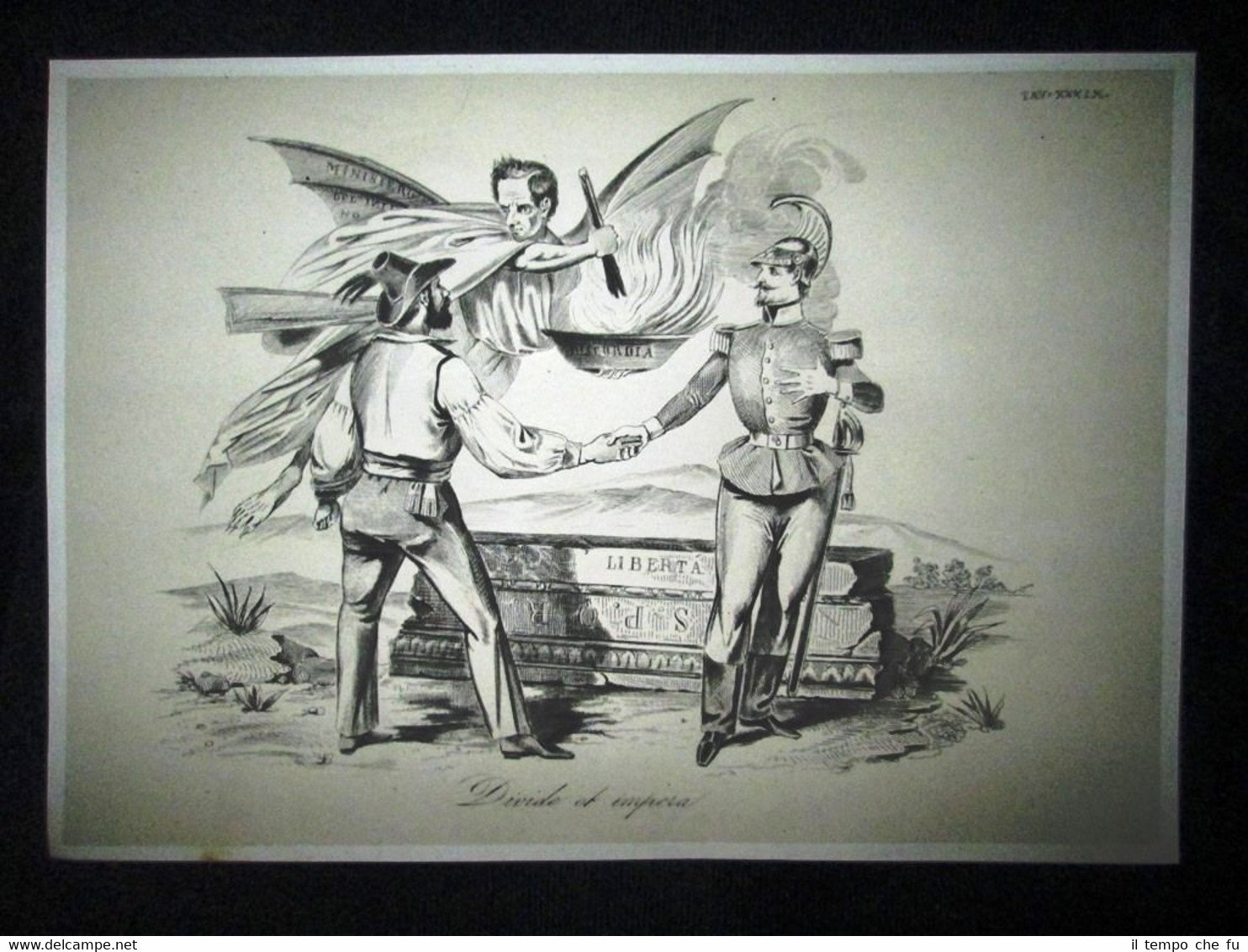 Preziosa ottocentina allegorico - caricaturale Tema: L'onnipotente Pellegrino Rossi, ministro promotore della civile discordia Bella e rara incisione all'acquaforte di satira pungente e dissacrante sui Moti del 1848, detti anche Rivoluzione del '48 o Primavera dei Popoli, che sconvolsero l'Italia e tutta l'Europa nel 1848 e 1849. Estratta dall'introvabile: Don Pirlone a Roma. Memorie di un Italiano dal 1°settembre 1848 al 31 dicembre 1850. Autore: Michelangelo Pinto Editore: Alessandro Fontana Anno di pubblicazione: 1851 DON PIRLONE - 004/XXXIX Dimensioni Cm 22,00 x 16,00 Qualora vogliate delle scansioni migliori contattateci, soddisferemo ogni vostra richiesta. Contesto storico: I moti del 1848, detti anche rivoluzione del '48 o Primavera dei popoli furono un'ondata di moti rivoluzionari borghesi che sconvolsero l'Europa nel 1848 e nel 1849. Scopo dei moti fu abbattere i governi della Restaurazione per sostituirli con governi liberali. Il loro impatto storico fu così profondo e violento che nel linguaggio corrente è entrata in uso l'espressione «fare un quarantotto» per sottintendere una improvvisa confusione e scompiglio. La prima agitazione europea del 1848 si verificò in Italia: la rivoluzione siciliana che esplose il 12 gennaio di quell'anno, che rappresentò la prima miccia dell'esplosione europea. L'insurrezione siciliana, infatti, spinse in un primo momento i Borbone a concedere il ritorno nell'Isola alla costituzione del 1812. Seguì una rivoluzione a Napoli, il 27, che costrinse, due giorni dopo, Ferdinando II a promettere una Costituzione, promulgata l'11 febbraio. Lo stesso 11 febbraio Leopoldo II di Toscana, cugino primo dell'imperatore Ferdinando I d'Austria, concesse la Costituzione, nella generale approvazione dei suoi sudditi. L'esempio borbonico fu seguito da Carlo Alberto di Savoia con lo Statuto Albertino e da Papa Pio IX con lo Statuto Fondamentale. Solo il re piemontese mantenne però lo Statuto. In Sicilia il parlamento proclamò in marzo l'indipendenza, che sarebbe durata fino al maggio 1849. Nel napoletano la concessione e la successiva repressione delle libertà costituzionali, portò dal maggio al settembre di quell'anno a una serie di moti. In tutto il Regno Lombardo-Veneto scoppiarono rivolte, come le Cinque giornate di Milano che sfociarono nella prima guerra di indipendenza. Nello Stato Pontificio una rivolta interna estromise papa Pio IX dai suoi poteri temporali e portò alla costituzione della Repubblica Romana. La rivoluzione delle Cinque giornate di Milano e altre proteste indussero il Re Carlo Alberto a dichiarare guerra all'Austria. Le truppe vennero presto sconfitte e solo quelle francesi poterono far retrocedere gli austriaci. La successiva ascesa al trono di Vittorio Emanuele II fece del Piemonte il motore propulsore del processo di unificazione italiana che tuttavia si sarebbe ottenuto solo nel 1861. Per quanto i Moti del '48 furono sedati abbastanza velocemente, le vittime furono decine di migliaia: il destino della democrazia europea ci è sfuggito di mano dichiarerà Pierre-Joseph Proudhon. Gli storici concordano che la Primavera dei popoli fu, alla fin fine, soprattutto un sanguinoso fallimento, se si eccettua la concessione dello Statuto Albertino nel Regno di Sardegna da parte di Carlo Alberto di Savoia, l'unica costituzione non revocata di quelle concesse o votate nel 1848-49. Vi furono tuttavia radicali e notevoli effetti a lungo termine: Germania e Italia sarebbero presto arrivate all'unificazione facendo leva anche sulla necessità di autodeterminazione dei popoli. Analogamente l'Ungheria sarebbe giunta ad un parziale riconoscimento della propria autonomia (a discapito della popolazione slava) grazie all'Ausgleich del 1867. In Prussia e Austria fu abolito il feudalesimo, mentre in Russia fu eliminata la servitù della gleba nel 1861. Tavola allegorico - caricaturale sullo stato dell'Italia del tempo, incisione su rame ricca di significato e rappresentazione mediante satirica dissacrante della condizione della nostra penisola oppressa. Le tavole dell'opera furono in parte riprese dal giornale romano Don Pirlone, quotidiano, uscito dal 1 settembre 1848 al 2 luglio 1849 (con una interruzione dl 29 aprile al 7 maggio 1849), ma in parte furono realizzate appositamente per questa opera. Tra gli incisori sono presenti anche i nomi di Ratti, Vaiani, Monneret, Gallucci, Pichi, Masutti. Il titolo Don Pirlone deriva quasi sicuramente da una maschera creata dallo scrittore satirico Girolamo Gigli (1660 - 1722). Si trattava di una specie di Tartufo molieresco, ispirato ad una figura reale, il canonico Feliciati di Sarteano. Nei tre volumi l'avvocato Michelangiolo Pinto raccolse tutto il pubblicato del giornale, che fu il più temuto e allo stesso tempo il più apprezzato tra i molteplici giornali satirici che si pubblicavano nella Roma di Pio IX all'epoca delle grandi riforme volute dal Papa. I romani gli dedicarono perfino una canzone (Davanti un numero di gran persone - che mi s