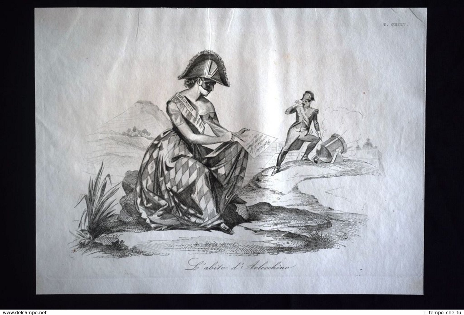 Preziosa ottocentina allegorico - caricaturale Tema: La sciagurata condizione di Roma, distrutta e decimata dalle bombe francesi, ha portato il magistrato municipale, validamente appoggiato dal console d'Inghilterra, a presentare al generale Oudinot documento di protesta contro i bombardamenti. Il generale francese risponde alla protestante diplomazia col raddoppiar le bombe Bella e rara incisione all'acquaforte di satira pungente e dissacrante sui Moti del 1848, detti anche Rivoluzione del '48 o Primavera dei Popoli, che sconvolsero l'Italia e tutta l'Europa nel 1848 e 1849. Estratta dall'introvabile: Don Pirlone a Roma. Memorie di un Italiano dal 1°settembre 1848 al 31 dicembre 1850. Autore: Michelangelo Pinto Editore: Alessandro Fontana Anno di pubblicazione: 1851 DON PIRLONE - 014/CXCIV Dimensioni Cm 22,00 x 16,00 Qualora vogliate delle scansioni migliori contattateci, soddisferemo ogni vostra richiesta. Contesto storico: I moti del 1848, detti anche rivoluzione del '48 o Primavera dei popoli furono un'ondata di moti rivoluzionari borghesi che sconvolsero l'Europa nel 1848 e nel 1849. Scopo dei moti fu abbattere i governi della Restaurazione per sostituirli con governi liberali. Il loro impatto storico fu così profondo e violento che nel linguaggio corrente è entrata in uso l'espressione «fare un quarantotto» per sottintendere una improvvisa confusione e scompiglio. La prima agitazione europea del 1848 si verificò in Italia: la rivoluzione siciliana che esplose il 12 gennaio di quell'anno, che rappresentò la prima miccia dell'esplosione europea. L'insurrezione siciliana, infatti, spinse in un primo momento i Borbone a concedere il ritorno nell'Isola alla costituzione del 1812. Seguì una rivoluzione a Napoli, il 27, che costrinse, due giorni dopo, Ferdinando II a promettere una Costituzione, promulgata l'11 febbraio. Lo stesso 11 febbraio Leopoldo II di Toscana, cugino primo dell'imperatore Ferdinando I d'Austria, concesse la Costituzione, nella generale approvazione dei suoi sudditi. L'esempio borbonico fu seguito da Carlo Alberto di Savoia con lo Statuto Albertino e da Papa Pio IX con lo Statuto Fondamentale. Solo il re piemontese mantenne però lo Statuto. In Sicilia il parlamento proclamò in marzo l'indipendenza, che sarebbe durata fino al maggio 1849. Nel napoletano la concessione e la successiva repressione delle libertà costituzionali, portò dal maggio al settembre di quell'anno a una serie di moti. In tutto il Regno Lombardo-Veneto scoppiarono rivolte, come le Cinque giornate di Milano che sfociarono nella prima guerra di indipendenza. Nello Stato Pontificio una rivolta interna estromise papa Pio IX dai suoi poteri temporali e portò alla costituzione della Repubblica Romana. La rivoluzione delle Cinque giornate di Milano e altre proteste indussero il Re Carlo Alberto a dichiarare guerra all'Austria. Le truppe vennero presto sconfitte e solo quelle francesi poterono far retrocedere gli austriaci. La successiva ascesa al trono di Vittorio Emanuele II fece del Piemonte il motore propulsore del processo di unificazione italiana che tuttavia si sarebbe ottenuto solo nel 1861. Per quanto i Moti del '48 furono sedati abbastanza velocemente, le vittime furono decine di migliaia: il destino della democrazia europea ci è sfuggito di mano dichiarerà Pierre-Joseph Proudhon. Gli storici concordano che la Primavera dei popoli fu, alla fin fine, soprattutto un sanguinoso fallimento, se si eccettua la concessione dello Statuto Albertino nel Regno di Sardegna da parte di Carlo Alberto di Savoia, l'unica costituzione non revocata di quelle concesse o votate nel 1848-49. Vi furono tuttavia radicali e notevoli effetti a lungo termine: Germania e Italia sarebbero presto arrivate all'unificazione facendo leva anche sulla necessità di autodeterminazione dei popoli. Analogamente l'Ungheria sarebbe giunta ad un parziale riconoscimento della propria autonomia (a discapito della popolazione slava) grazie all'Ausgleich del 1867. In Prussia e Austria fu abolito il feudalesimo, mentre in Russia fu eliminata la servitù della gleba nel 1861. Tavola allegorico - caricaturale sullo stato dell'Italia del tempo, incisione su rame ricca di significato e rappresentazione mediante satirica dissacrante della condizione della nostra penisola oppressa. Le tavole dell'opera furono in parte riprese dal giornale romano Don Pirlone, quotidiano, uscito dal 1 settembre 1848 al 2 luglio 1849 (con una interruzione dl 29 aprile al 7 maggio 1849), ma in parte furono realizzate appositamente per questa opera. Tra gli incisori sono presenti anche i nomi di Ratti, Vaiani, Monneret, Gallucci, Pichi, Masutti. Il titolo Don Pirlone deriva quasi sicuramente da una maschera creata dallo scrittore satirico Girolamo Gigli (1660 - 1722). Si trattava di una specie di Tartufo molieresco, ispirato ad una figura reale, il canonico Feliciati di Sarteano. Nei tre volumi l'avvocato Michelangiolo Pinto raccolse tutto il pubblicato del giornale, che fu il più temuto