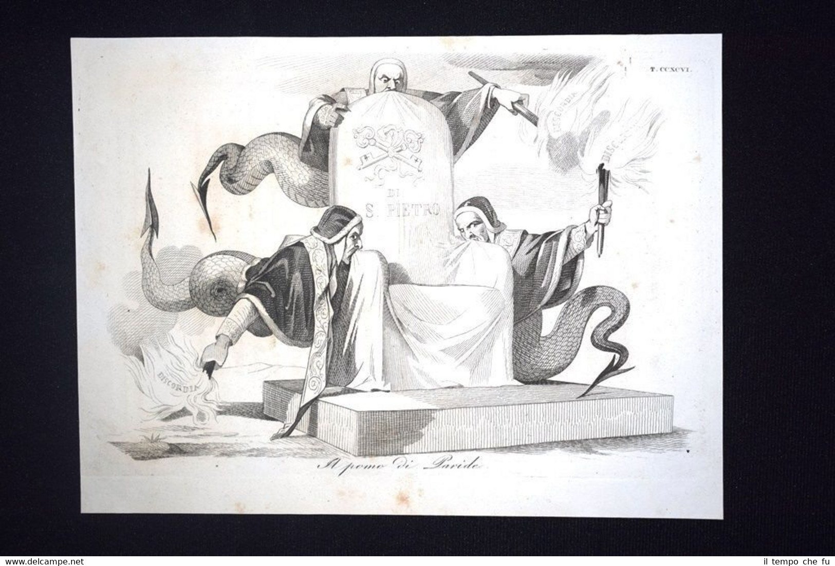 Preziosa ottocentina allegorico - caricaturale Tema: I molti pretendenti al trono di San Pietro, ciascuno alla ricerca dell'appoggio delle fazioni civili e delle armi straniere Bella e rara incisione all'acquaforte di satira pungente e dissacrante sui Moti del 1848, detti anche Rivoluzione del '48 o Primavera dei Popoli, che sconvolsero l'Italia e tutta l'Europa nel 1848 e 1849. Estratta dall'introvabile: Don Pirlone a Roma. Memorie di un Italiano dal 1°settembre 1848 al 31 dicembre 1850. Autore: Michelangelo Pinto Editore: Alessandro Fontana Anno di pubblicazione: 1851 DON PIRLONE - 023/CCXCVI Dimensioni Cm 22,00 x 16,00 Qualora vogliate delle scansioni migliori contattateci, soddisferemo ogni vostra richiesta. Contesto storico: I moti del 1848, detti anche rivoluzione del '48 o Primavera dei popoli furono un'ondata di moti rivoluzionari borghesi che sconvolsero l'Europa nel 1848 e nel 1849. Scopo dei moti fu abbattere i governi della Restaurazione per sostituirli con governi liberali. Il loro impatto storico fu così profondo e violento che nel linguaggio corrente è entrata in uso l'espressione «fare un quarantotto» per sottintendere una improvvisa confusione e scompiglio. La prima agitazione europea del 1848 si verificò in Italia: la rivoluzione siciliana che esplose il 12 gennaio di quell'anno, che rappresentò la prima miccia dell'esplosione europea. L'insurrezione siciliana, infatti, spinse in un primo momento i Borbone a concedere il ritorno nell'Isola alla costituzione del 1812. Seguì una rivoluzione a Napoli, il 27, che costrinse, due giorni dopo, Ferdinando II a promettere una Costituzione, promulgata l'11 febbraio. Lo stesso 11 febbraio Leopoldo II di Toscana, cugino primo dell'imperatore Ferdinando I d'Austria, concesse la Costituzione, nella generale approvazione dei suoi sudditi. L'esempio borbonico fu seguito da Carlo Alberto di Savoia con lo Statuto Albertino e da Papa Pio IX con lo Statuto Fondamentale. Solo il re piemontese mantenne però lo Statuto. In Sicilia il parlamento proclamò in marzo l'indipendenza, che sarebbe durata fino al maggio 1849. Nel napoletano la concessione e la successiva repressione delle libertà costituzionali, portò dal maggio al settembre di quell'anno a una serie di moti. In tutto il Regno Lombardo-Veneto scoppiarono rivolte, come le Cinque giornate di Milano che sfociarono nella prima guerra di indipendenza. Nello Stato Pontificio una rivolta interna estromise papa Pio IX dai suoi poteri temporali e portò alla costituzione della Repubblica Romana. La rivoluzione delle Cinque giornate di Milano e altre proteste indussero il Re Carlo Alberto a dichiarare guerra all'Austria. Le truppe vennero presto sconfitte e solo quelle francesi poterono far retrocedere gli austriaci. La successiva ascesa al trono di Vittorio Emanuele II fece del Piemonte il motore propulsore del processo di unificazione italiana che tuttavia si sarebbe ottenuto solo nel 1861. Per quanto i Moti del '48 furono sedati abbastanza velocemente, le vittime furono decine di migliaia: il destino della democrazia europea ci è sfuggito di mano dichiarerà Pierre-Joseph Proudhon. Gli storici concordano che la Primavera dei popoli fu, alla fin fine, soprattutto un sanguinoso fallimento, se si eccettua la concessione dello Statuto Albertino nel Regno di Sardegna da parte di Carlo Alberto di Savoia, l'unica costituzione non revocata di quelle concesse o votate nel 1848-49. Vi furono tuttavia radicali e notevoli effetti a lungo termine: Germania e Italia sarebbero presto arrivate all'unificazione facendo leva anche sulla necessità di autodeterminazione dei popoli. Analogamente l'Ungheria sarebbe giunta ad un parziale riconoscimento della propria autonomia (a discapito della popolazione slava) grazie all'Ausgleich del 1867. In Prussia e Austria fu abolito il feudalesimo, mentre in Russia fu eliminata la servitù della gleba nel 1861. Tavola allegorico - caricaturale sullo stato dell'Italia del tempo, incisione su rame ricca di significato e rappresentazione mediante satirica dissacrante della condizione della nostra penisola oppressa. Le tavole dell'opera furono in parte riprese dal giornale romano Don Pirlone, quotidiano, uscito dal 1 settembre 1848 al 2 luglio 1849 (con una interruzione dl 29 aprile al 7 maggio 1849), ma in parte furono realizzate appositamente per questa opera. Tra gli incisori sono presenti anche i nomi di Ratti, Vaiani, Monneret, Gallucci, Pichi, Masutti. Il titolo Don Pirlone deriva quasi sicuramente da una maschera creata dallo scrittore satirico Girolamo Gigli (1660 - 1722). Si trattava di una specie di Tartufo molieresco, ispirato ad una figura reale, il canonico Feliciati di Sarteano. Nei tre volumi l'avvocato Michelangiolo Pinto raccolse tutto il pubblicato del giornale, che fu il più temuto e allo stesso tempo il più apprezzato tra i molteplici giornali satirici che si pubblicavano nella Roma di Pio IX all'epoca delle grandi riforme volute dal Papa. I romani gli dedicarono perfino una ca