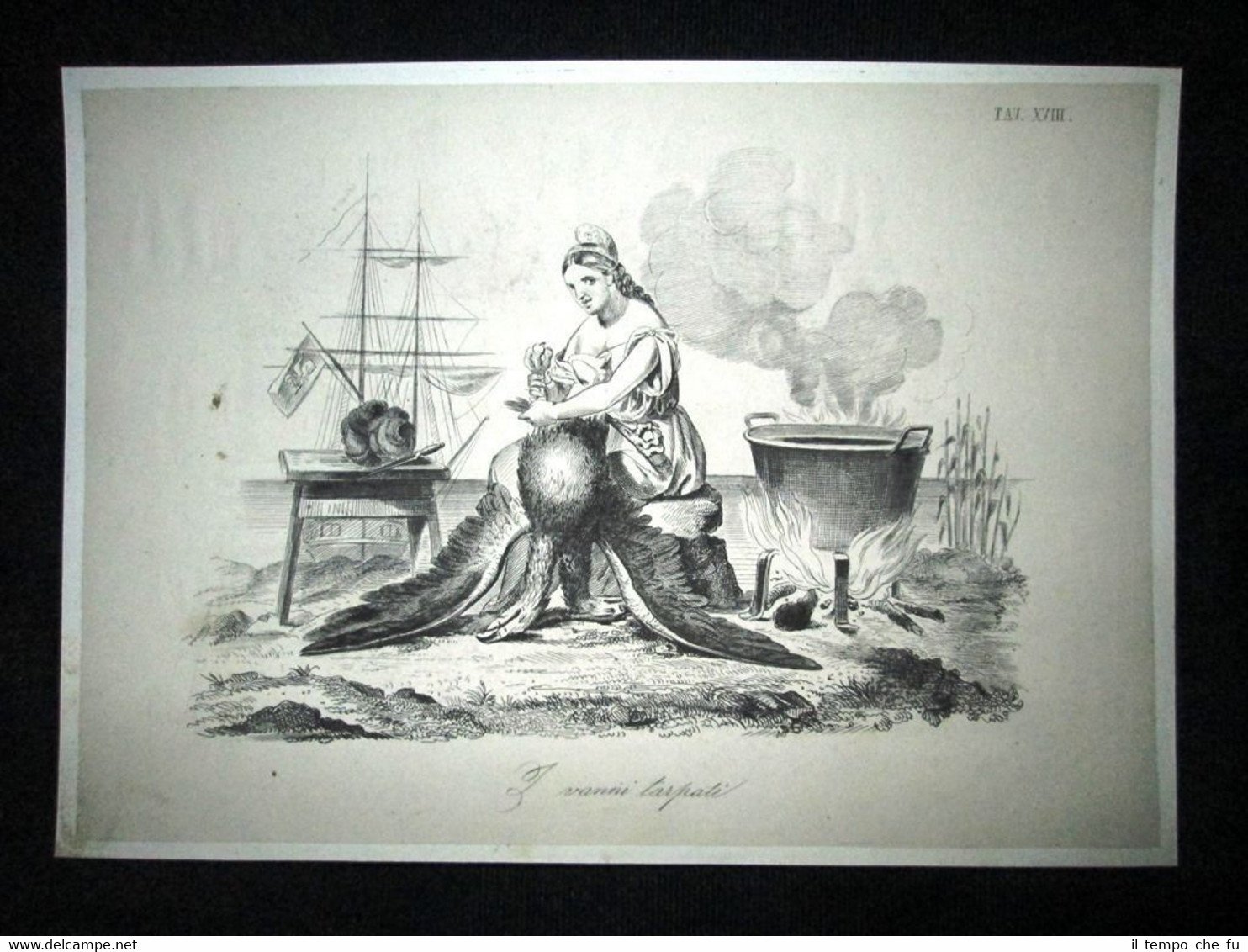 Preziosa ottocentina allegorico - caricaturale Tema: L'alta Italia soccombe davanti ai frequenti eccessi della più inumana barbarie. Solo l'indomito leone di San Marco, la Repubblica di Venezia non asseconda le illusioni di governi stranieri e si erge come trofeo vivente e glorioso della rivoluzione italiana, arrestando sulle proprie lagune le intenzioni dell'invasore austriaco Bella e rara incisione all'acquaforte di satira pungente e dissacrante sui Moti del 1848, detti anche Rivoluzione del '48 o Primavera dei Popoli, che sconvolsero l'Italia e tutta l'Europa nel 1848 e 1849. Estratta dall'introvabile: Don Pirlone a Roma. Memorie di un Italiano dal 1°settembre 1848 al 31 dicembre 1850. Autore: Michelangelo Pinto Editore: Alessandro Fontana Anno di pubblicazione: 1851 DON PIRLONE - 002/XVIII Dimensioni Cm 22,00 x 16,00 Qualora vogliate delle scansioni migliori contattateci, soddisferemo ogni vostra richiesta. Contesto storico: I moti del 1848, detti anche rivoluzione del '48 o Primavera dei popoli furono un'ondata di moti rivoluzionari borghesi che sconvolsero l'Europa nel 1848 e nel 1849. Scopo dei moti fu abbattere i governi della Restaurazione per sostituirli con governi liberali. Il loro impatto storico fu così profondo e violento che nel linguaggio corrente è entrata in uso l'espressione «fare un quarantotto» per sottintendere una improvvisa confusione e scompiglio. La prima agitazione europea del 1848 si verificò in Italia: la rivoluzione siciliana che esplose il 12 gennaio di quell'anno, che rappresentò la prima miccia dell'esplosione europea. L'insurrezione siciliana, infatti, spinse in un primo momento i Borbone a concedere il ritorno nell'Isola alla costituzione del 1812. Seguì una rivoluzione a Napoli, il 27, che costrinse, due giorni dopo, Ferdinando II a promettere una Costituzione, promulgata l'11 febbraio. Lo stesso 11 febbraio Leopoldo II di Toscana, cugino primo dell'imperatore Ferdinando I d'Austria, concesse la Costituzione, nella generale approvazione dei suoi sudditi. L'esempio borbonico fu seguito da Carlo Alberto di Savoia con lo Statuto Albertino e da Papa Pio IX con lo Statuto Fondamentale. Solo il re piemontese mantenne però lo Statuto. In Sicilia il parlamento proclamò in marzo l'indipendenza, che sarebbe durata fino al maggio 1849. Nel napoletano la concessione e la successiva repressione delle libertà costituzionali, portò dal maggio al settembre di quell'anno a una serie di moti. In tutto il Regno Lombardo-Veneto scoppiarono rivolte, come le Cinque giornate di Milano che sfociarono nella prima guerra di indipendenza. Nello Stato Pontificio una rivolta interna estromise papa Pio IX dai suoi poteri temporali e portò alla costituzione della Repubblica Romana. La rivoluzione delle Cinque giornate di Milano e altre proteste indussero il Re Carlo Alberto a dichiarare guerra all'Austria. Le truppe vennero presto sconfitte e solo quelle francesi poterono far retrocedere gli austriaci. La successiva ascesa al trono di Vittorio Emanuele II fece del Piemonte il motore propulsore del processo di unificazione italiana che tuttavia si sarebbe ottenuto solo nel 1861. Per quanto i Moti del '48 furono sedati abbastanza velocemente, le vittime furono decine di migliaia: il destino della democrazia europea ci è sfuggito di mano dichiarerà Pierre-Joseph Proudhon. Gli storici concordano che la Primavera dei popoli fu, alla fin fine, soprattutto un sanguinoso fallimento, se si eccettua la concessione dello Statuto Albertino nel Regno di Sardegna da parte di Carlo Alberto di Savoia, l'unica costituzione non revocata di quelle concesse o votate nel 1848-49. Vi furono tuttavia radicali e notevoli effetti a lungo termine: Germania e Italia sarebbero presto arrivate all'unificazione facendo leva anche sulla necessità di autodeterminazione dei popoli. Analogamente l'Ungheria sarebbe giunta ad un parziale riconoscimento della propria autonomia (a discapito della popolazione slava) grazie all'Ausgleich del 1867. In Prussia e Austria fu abolito il feudalesimo, mentre in Russia fu eliminata la servitù della gleba nel 1861. Tavola allegorico - caricaturale sullo stato dell'Italia del tempo, incisione su rame ricca di significato e rappresentazione mediante satirica dissacrante della condizione della nostra penisola oppressa. Le tavole dell'opera furono in parte riprese dal giornale romano Don Pirlone, quotidiano, uscito dal 1 settembre 1848 al 2 luglio 1849 (con una interruzione dl 29 aprile al 7 maggio 1849), ma in parte furono realizzate appositamente per questa opera. Tra gli incisori sono presenti anche i nomi di Ratti, Vaiani, Monneret, Gallucci, Pichi, Masutti. Il titolo Don Pirlone deriva quasi sicuramente da una maschera creata dallo scrittore satirico Girolamo Gigli (1660 - 1722). Si trattava di una specie di Tartufo molieresco, ispirato ad una figura reale, il canonico Feliciati di Sarteano. Nei tre volumi l'avvocato Michelangiolo Pinto raccolse tutto il pubblicato del giornale, che fu il più temu