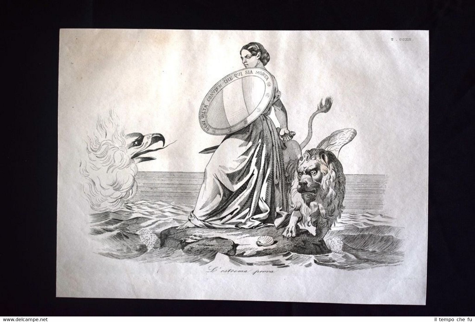 Preziosa ottocentina allegorico - caricaturale Tema: Abbandonata dalle truppe e dalla flotta piemontesi, Venezia è minacciata dall'impero Austriaco: il generale Guglielmo Pepe e i suoi volontari offrono il supporto alla Repubblica di San Marco che ripete a se stessa: "Ogni viltà convien che qui sia morta" Bella e rara incisione all'acquaforte di satira pungente e dissacrante sui Moti del 1848, detti anche Rivoluzione del '48 o Primavera dei Popoli, che sconvolsero l'Italia e tutta l'Europa nel 1848 e 1849. Estratta dall'introvabile: Don Pirlone a Roma. Memorie di un Italiano dal 1°settembre 1848 al 31 dicembre 1850. Autore: Michelangelo Pinto Editore: Alessandro Fontana Anno di pubblicazione: 1851 DON PIRLONE - 016/CCXII Dimensioni Cm 22,00 x 16,00 Qualora vogliate delle scansioni migliori contattateci, soddisferemo ogni vostra richiesta. Contesto storico: I moti del 1848, detti anche rivoluzione del '48 o Primavera dei popoli furono un'ondata di moti rivoluzionari borghesi che sconvolsero l'Europa nel 1848 e nel 1849. Scopo dei moti fu abbattere i governi della Restaurazione per sostituirli con governi liberali. Il loro impatto storico fu così profondo e violento che nel linguaggio corrente è entrata in uso l'espressione «fare un quarantotto» per sottintendere una improvvisa confusione e scompiglio. La prima agitazione europea del 1848 si verificò in Italia: la rivoluzione siciliana che esplose il 12 gennaio di quell'anno, che rappresentò la prima miccia dell'esplosione europea. L'insurrezione siciliana, infatti, spinse in un primo momento i Borbone a concedere il ritorno nell'Isola alla costituzione del 1812. Seguì una rivoluzione a Napoli, il 27, che costrinse, due giorni dopo, Ferdinando II a promettere una Costituzione, promulgata l'11 febbraio. Lo stesso 11 febbraio Leopoldo II di Toscana, cugino primo dell'imperatore Ferdinando I d'Austria, concesse la Costituzione, nella generale approvazione dei suoi sudditi. L'esempio borbonico fu seguito da Carlo Alberto di Savoia con lo Statuto Albertino e da Papa Pio IX con lo Statuto Fondamentale. Solo il re piemontese mantenne però lo Statuto. In Sicilia il parlamento proclamò in marzo l'indipendenza, che sarebbe durata fino al maggio 1849. Nel napoletano la concessione e la successiva repressione delle libertà costituzionali, portò dal maggio al settembre di quell'anno a una serie di moti. In tutto il Regno Lombardo-Veneto scoppiarono rivolte, come le Cinque giornate di Milano che sfociarono nella prima guerra di indipendenza. Nello Stato Pontificio una rivolta interna estromise papa Pio IX dai suoi poteri temporali e portò alla costituzione della Repubblica Romana. La rivoluzione delle Cinque giornate di Milano e altre proteste indussero il Re Carlo Alberto a dichiarare guerra all'Austria. Le truppe vennero presto sconfitte e solo quelle francesi poterono far retrocedere gli austriaci. La successiva ascesa al trono di Vittorio Emanuele II fece del Piemonte il motore propulsore del processo di unificazione italiana che tuttavia si sarebbe ottenuto solo nel 1861. Per quanto i Moti del '48 furono sedati abbastanza velocemente, le vittime furono decine di migliaia: il destino della democrazia europea ci è sfuggito di mano dichiarerà Pierre-Joseph Proudhon. Gli storici concordano che la Primavera dei popoli fu, alla fin fine, soprattutto un sanguinoso fallimento, se si eccettua la concessione dello Statuto Albertino nel Regno di Sardegna da parte di Carlo Alberto di Savoia, l'unica costituzione non revocata di quelle concesse o votate nel 1848-49. Vi furono tuttavia radicali e notevoli effetti a lungo termine: Germania e Italia sarebbero presto arrivate all'unificazione facendo leva anche sulla necessità di autodeterminazione dei popoli. Analogamente l'Ungheria sarebbe giunta ad un parziale riconoscimento della propria autonomia (a discapito della popolazione slava) grazie all'Ausgleich del 1867. In Prussia e Austria fu abolito il feudalesimo, mentre in Russia fu eliminata la servitù della gleba nel 1861. Tavola allegorico - caricaturale sullo stato dell'Italia del tempo, incisione su rame ricca di significato e rappresentazione mediante satirica dissacrante della condizione della nostra penisola oppressa. Le tavole dell'opera furono in parte riprese dal giornale romano Don Pirlone, quotidiano, uscito dal 1 settembre 1848 al 2 luglio 1849 (con una interruzione dl 29 aprile al 7 maggio 1849), ma in parte furono realizzate appositamente per questa opera. Tra gli incisori sono presenti anche i nomi di Ratti, Vaiani, Monneret, Gallucci, Pichi, Masutti. Il titolo Don Pirlone deriva quasi sicuramente da una maschera creata dallo scrittore satirico Girolamo Gigli (1660 - 1722). Si trattava di una specie di Tartufo molieresco, ispirato ad una figura reale, il canonico Feliciati di Sarteano. Nei tre volumi l'avvocato Michelangiolo Pinto raccolse tutto il pubblicato del giornale, che fu il più temuto e allo stesso tempo il più apprezzato tra i molteplici giornali satiric