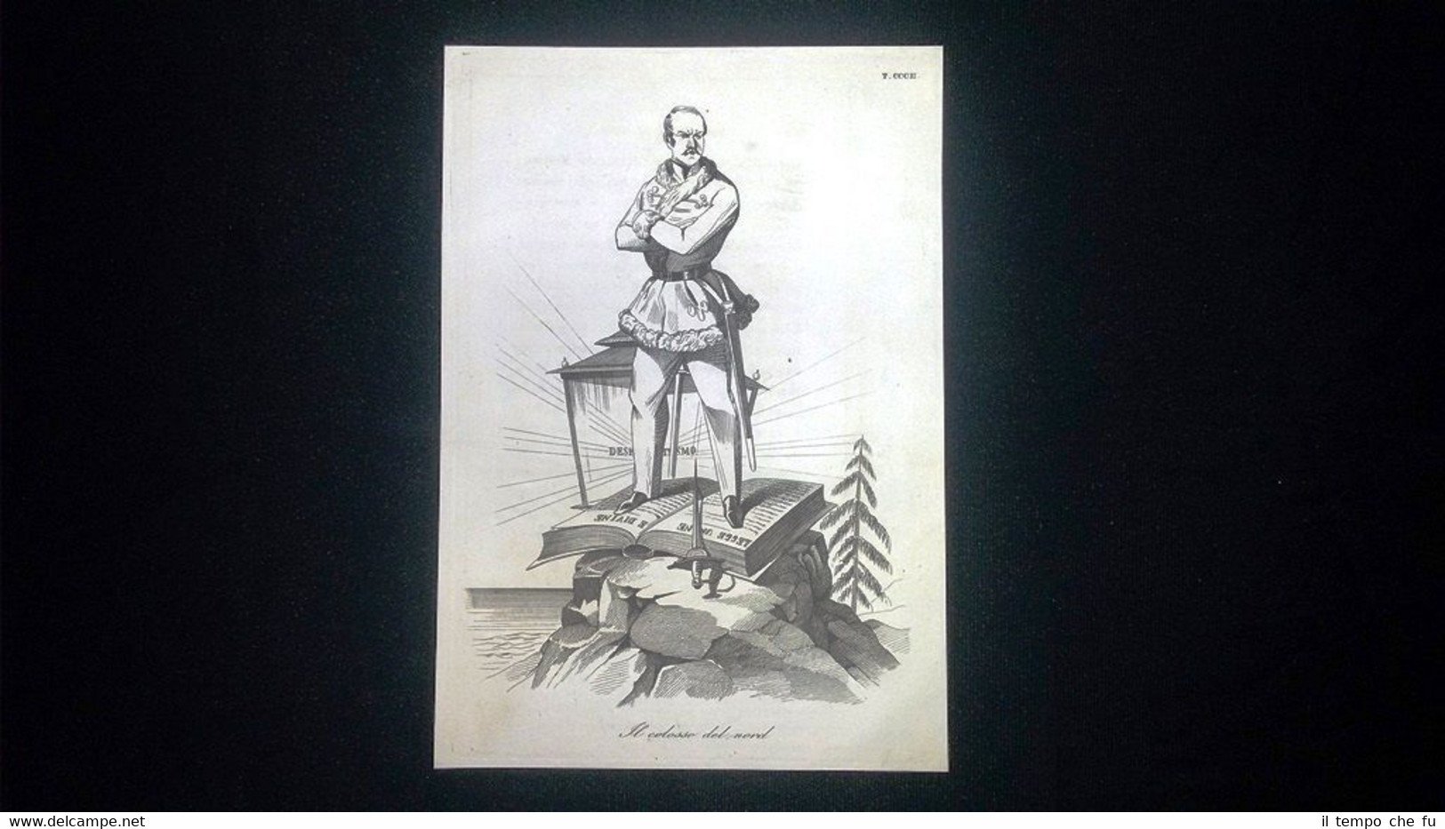 Incisione d'allegoria e satira Zar di Russia Nicola Romanof Don Pirlone 1851