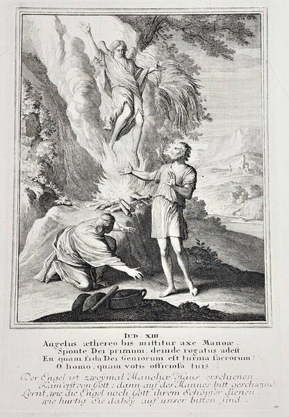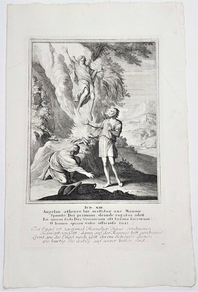 Incisione print Annuncio della nascita di Sansone Vecchio testamento 1708 c Weigel