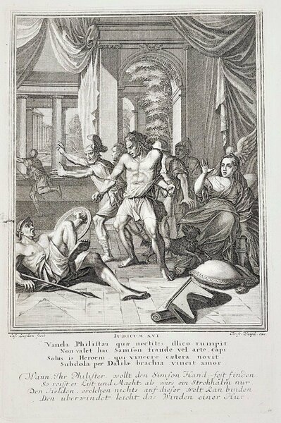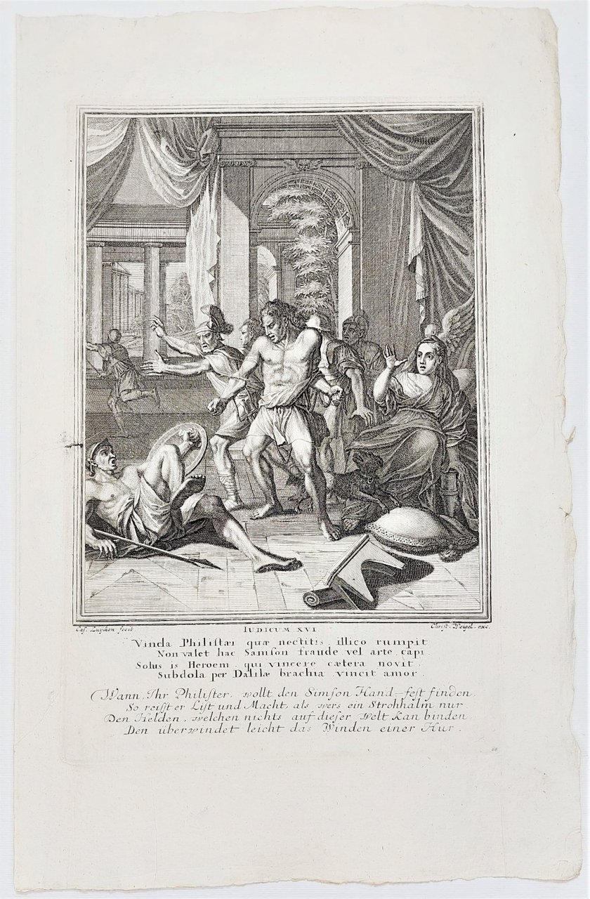Incisione print Dalila e la cattura di Sansone inc. C. L. Vecchio testamento 1708 c Weigel