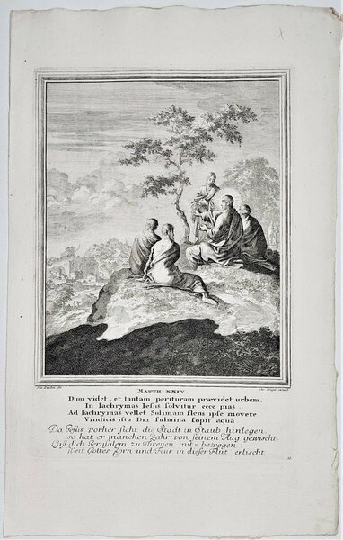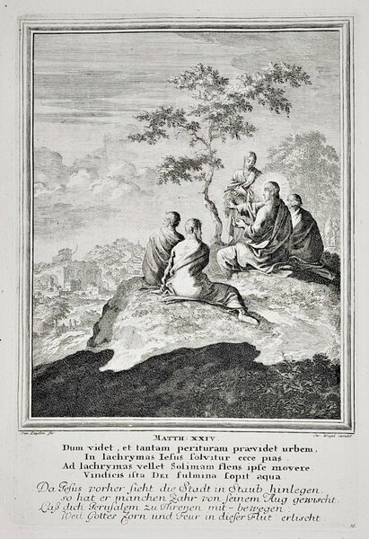 Incisione print Gesù prevede la distruzione di Gerusalemme inc. Jan Luyken Nuovo testamento 1708 c Weigel