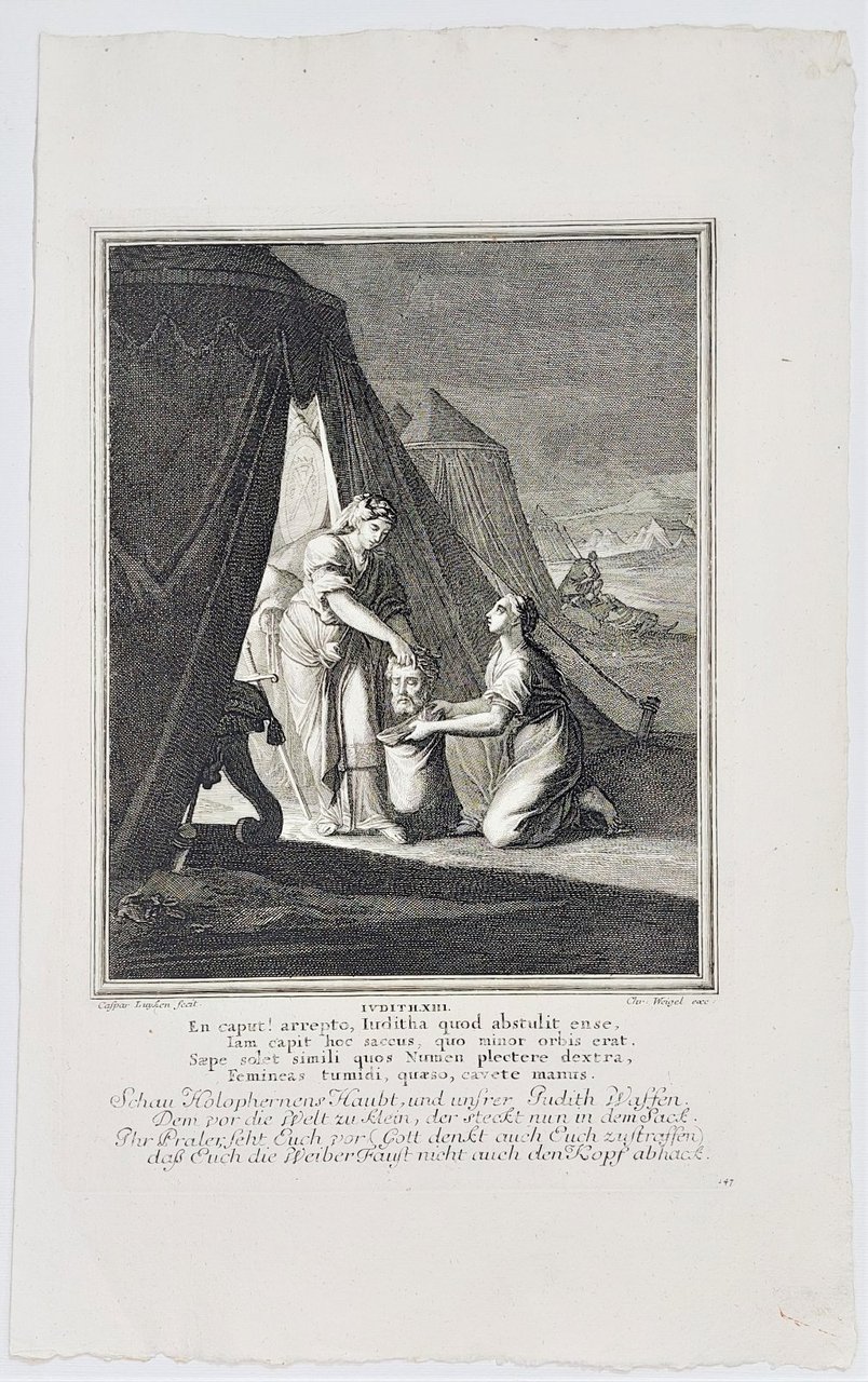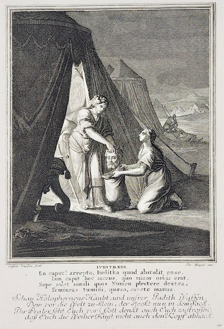 Incisione print Giuditta uccide Oloferne inc. Caspar Luyken Vecchio testamento 1708 c Weigel
