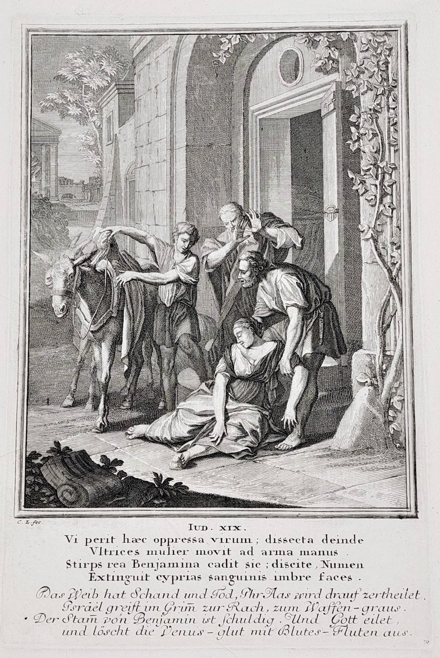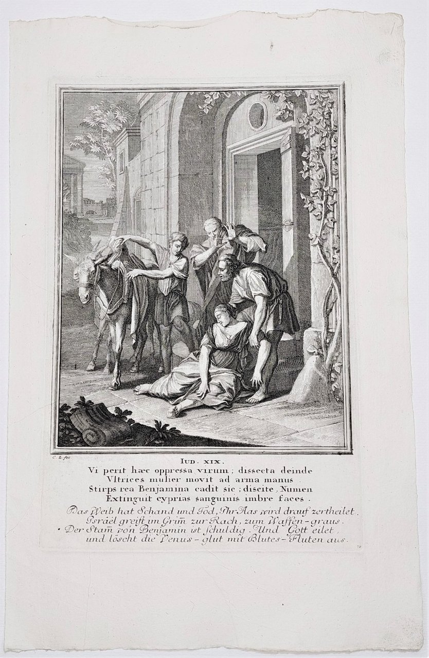 Incisione print Il delitto di Gàbaa e la guerra contro Beniamino inc. C. L. Vecchio testamento 1708 c Weigel