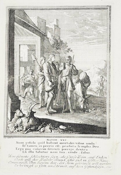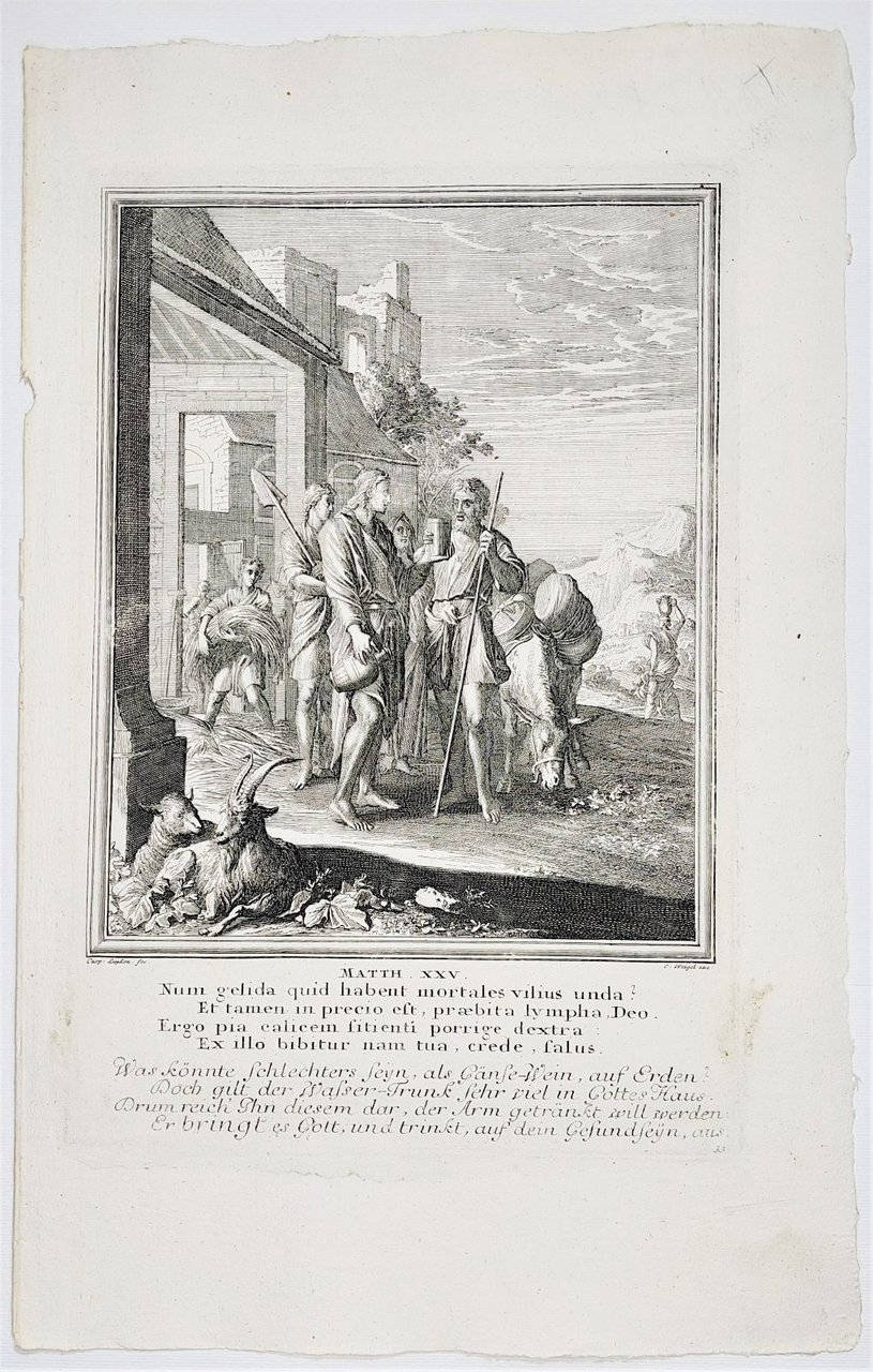 Incisione print Il giudizio universale Le opere di misericordia inc. Caspar Luyken Nuovo testamento 1708 c Weigel