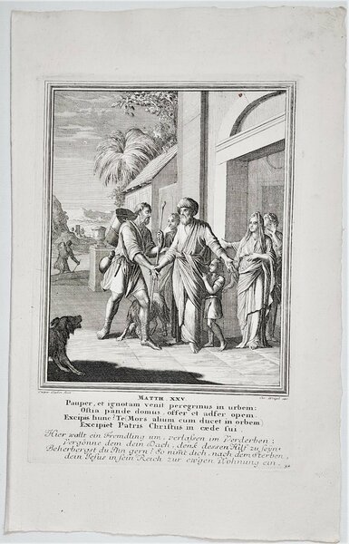 Incisione print Le opere di misericordia ero straniero e mi avete accolto inc. Caspar Luyken Nuovo testamento 1708 c Weigel