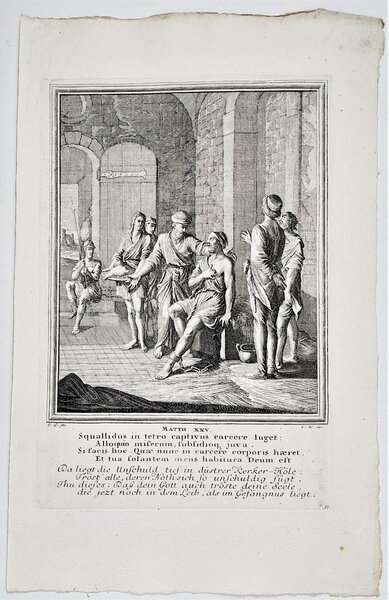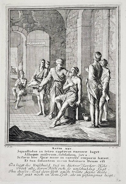 Incisione print Le opere di misericordia Nuovo testamento inc. C. L. fec. Nuovo testamento 1708 c Weigel