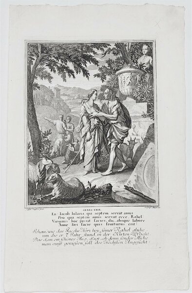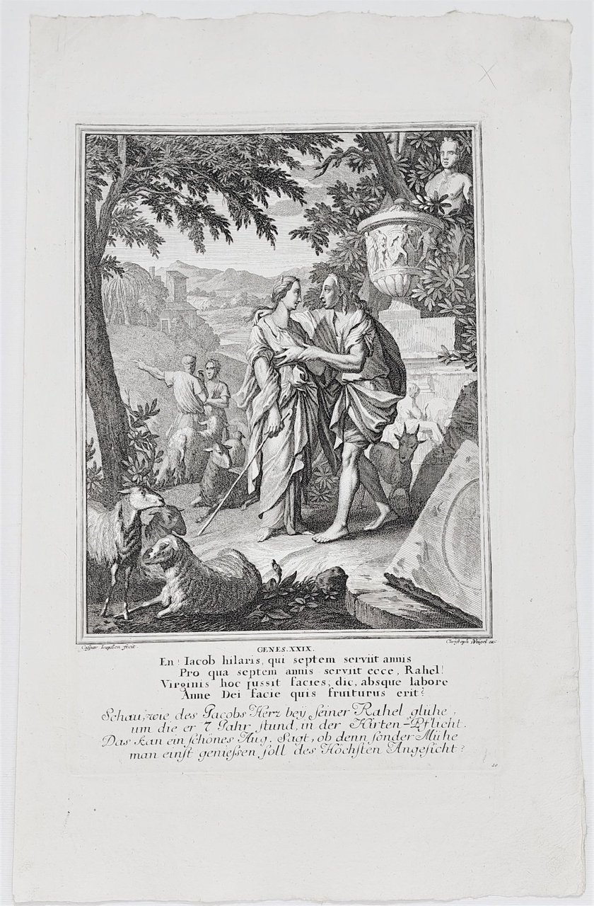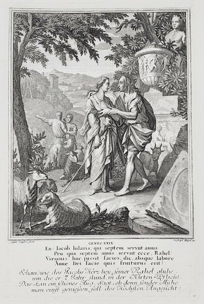 Incisione print Matrimonio di Giacobbe con Lia e Rachele inc. C. Luyken Vecchio testamento 1708 c Weigel