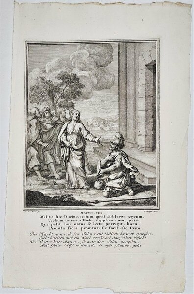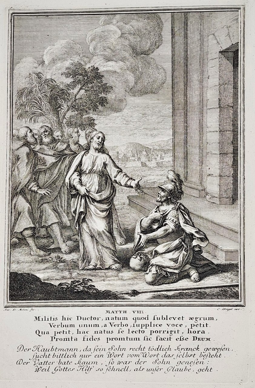 Incisione Print Miracolo di Gesù La fede del centurione F. A. Meloni Nuovo testamento 1708 c