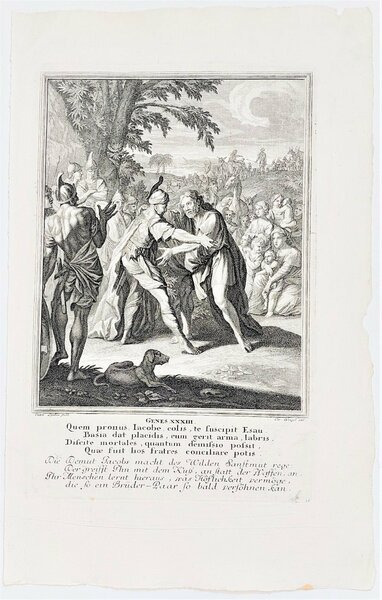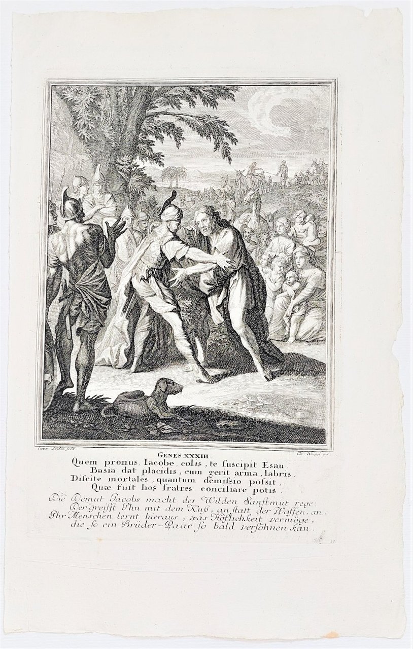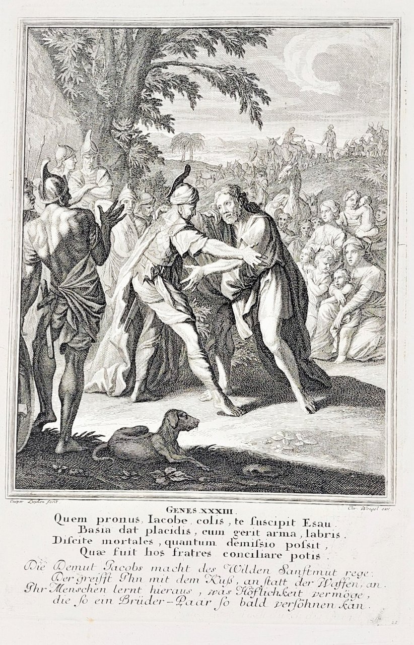 Incisione print Riconciliazione e separazione tra Giacobbe e Esaù inc. C. Luyken Vecchio testamento 1708 c Weigel