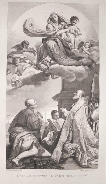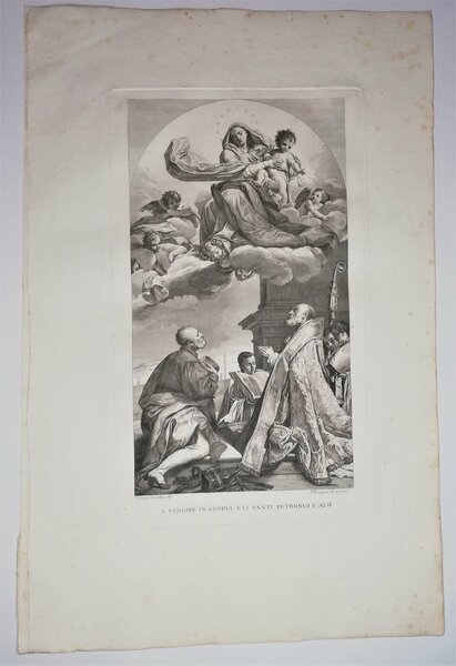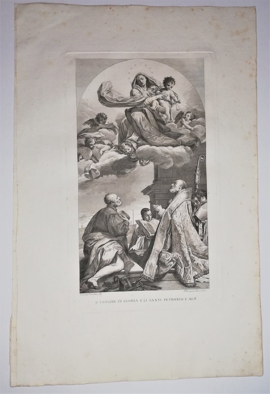 Incisione stampa F Rosaspina Beata Vergine in Gloria e S. Petronio e Alò 1830