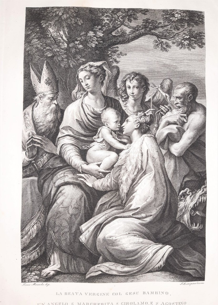 Incisione su rame di F Rosaspina da un dipinto di Francesco Mazzola detto Il Parmeggianino La Beata Vergine col Gesù bambino un angelo Santa Margherita San Girolamo e Sant'Agostino 1830 dimensioni cm 46,7 * 30,7 incisione cm. 25,5 x 17