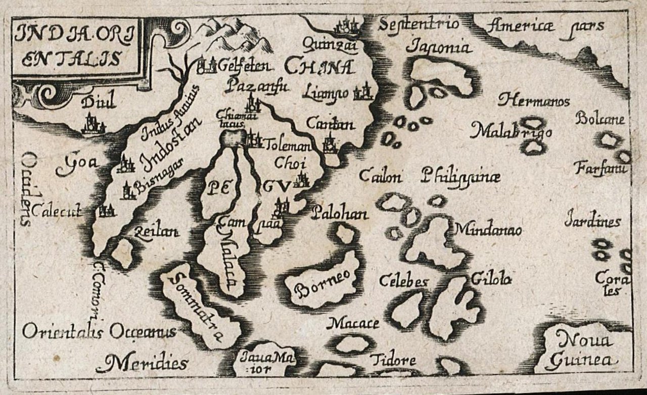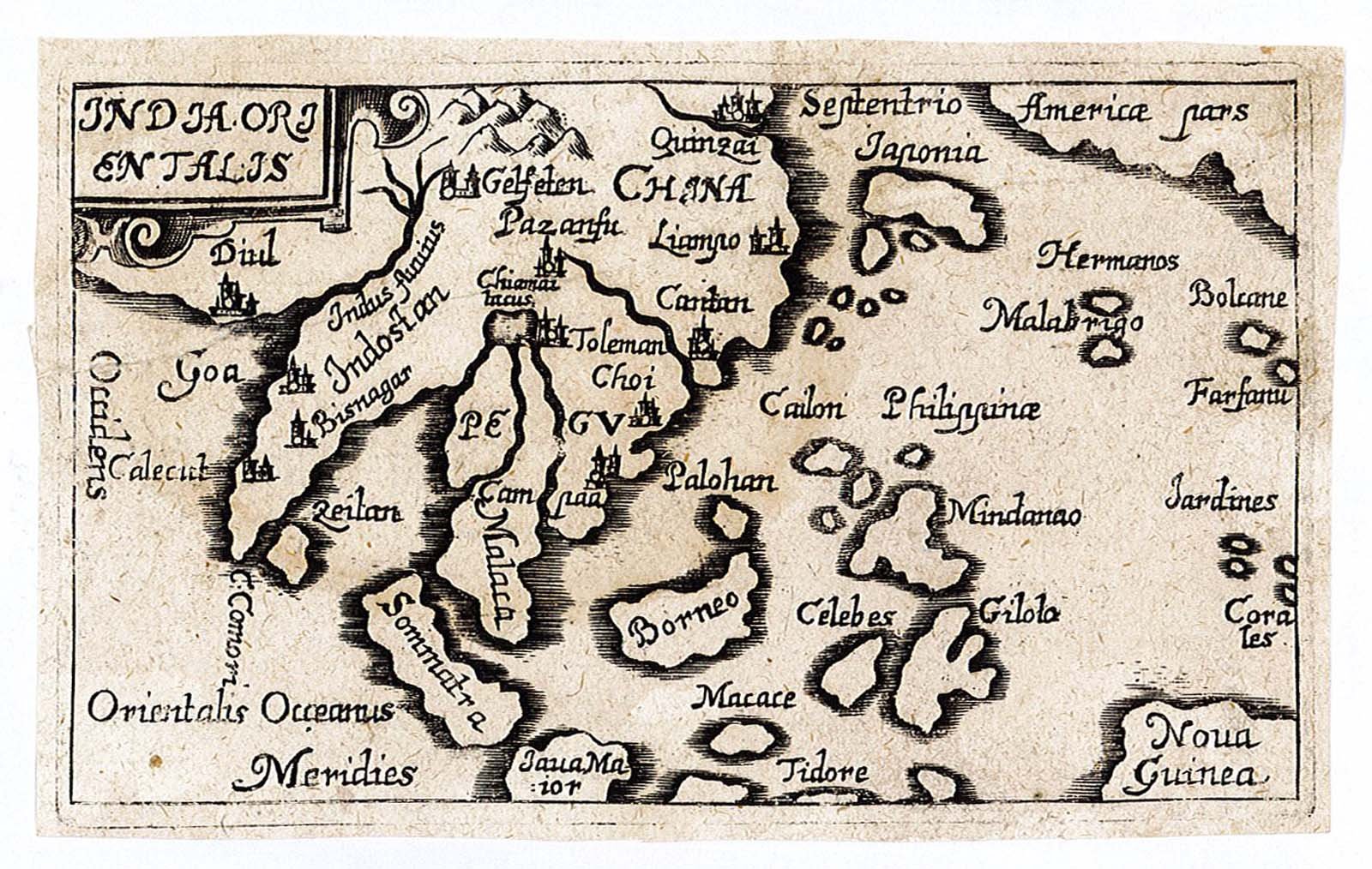 Piccola carta geografica delle Indie Orientali, Indostan, Cina, Giappone e di parte dell'Oceano Pacifico fino alla costa nord occidentale dell'America disegnata dal Bucelino. Questa fa parte di una serie di trenta piccole carte che il King, nel suo volume "Miniature Antique Maps", definisce ".scarce maps." e con ogni probabilità incise da Melchior Kusell. Antico restauro al margine sinistro, senza fastidio. Testo al verso