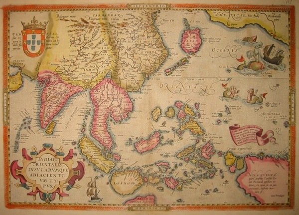 Incisione originale su rame (cm. 49,5x35 più ampi margini bianchi) tratta dal ‘Theatrum Orbis Terrarum’. Splendida coloritura antica all’acquarello. Abili minimi restauri lungo la piegatura centrale ma ottimo esemplare. Provenienza: Biblioteca del Castello di Cirey. Van den Broecke, 166.