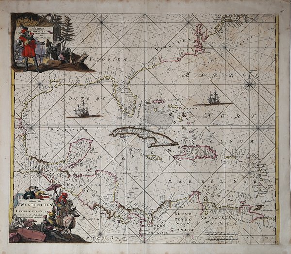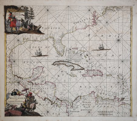 Seconda edizione della carta nautica del 1680 di Frederick de Wit, una mappa marittima delle Indie Occidentali, dell'America Centrale, del Golfo del Messico e della Florida. La mappa offre una rappresentazione abbastanza dettagliata delle isole delle Indie Occidentali, della Florida e dell'America centrale. La costa americana a nord della Florida è esageratamente inclinata verso nord-est, un errore che sarebbe stato corretto all'inizio del XVIII secolo. Allo stesso modo, lo Yuchatan appare in una rappresentazione errata comune alla maggior parte delle mappe olandesi fino alla fine del XVIII secolo. Si noti che il delta del fiume Mississippi non è stato ancora identificato, ma numerosi nomi di luoghi lungo la costa sono rappresentati, seppur in modo congetturale. Il tutto è pieno di linee lossodromiche e illustrazioni di galeoni. Cartograficamente la mappa è parzialmente derivata da quella di Hessel di Gerritsz del 1631 con gli aggiornamenti derivati ?dalla mappa di Joannes van Loon del 1661. Questa mappa fu pubblicata nell'Orbis Maritimus ofte Zee Atlas di de Wit del 1680. Fu incisa da Romeyn de Hooghe. La seconda edizione può essere identificata dalla presenza della costa occidentale del Centro America e dall'aggiunta di New Amsterdam nel quadrante in alto a destra. Due edizioni successive furono pubblicate da Louis Renard e dalla famiglia Ottens. Tutte le edizioni di questa mappa sono rare. Frederick de Wit (1630 circa - 1706) era un cartografo ed editore, originario di Gouda. Si trasferì ad Amsterdam nel 1648, studiando sotto la direzione della famiglia Blaeu e, nel 1654 iniziò la propria attività, aprendo una tipografia con insegna “I tre granchi”, che in seguito cambiò in “The White Chart”. Nel 1660 pubblicò la sua mappa del mondo, Nova Totius Terrarum Orbis Tabula, realizzata sia come mappa murale che come riduzione in formato da atlante in-folio (cfr. Shirley, The Mapping of the World, n. 444). Due anni dopo iniziò a stampare atlanti che venivano assemblati essenzialmente su esigenza del committente, alcuni dei quali comprendevano oltre 150 mappe. Dopo aver sposato Maria van der Way, originaria di Amsterdam, de Wit ottenne i privilegi di cittadino e divenne membro della corporazione di città di San Luca, nel 1664. Nel 1675 pubblica il suo sontuoso atlante nautico, Orbis Maritimus ofte Zee Atlas, noto anche per la sua decorazione elaborata. Nel 1695, pubblica un libro di vedute della città dei Paesi Bassi, Perfekte aftekeningen der steden van del XVII Nederlandsche provincien. Dopo la morte di de Wit, la sua vedova, Maria, continuò l’attività fino al 1710. Il loro figlio, Franciscus, era un commerciante di pesce e non aveva interesse per il negozio di mappe. La tipografia fu, quindi, venduta in asta e la maggior parte delle lastre venne acquistata da Pieter Mortier. Le 27 tavole del suo atlante nautico del 1675 furono successivamente vendute, in un’asta nel 1710, al tipografo e libraio di Amsterdam Louis Renard che le pubblicò con il proprio nome e con alcune modifiche nel 1715. Acquaforte, bella coloritura coeva, piccole ossidazioni, per il resto in ottimo stato di conservazione. Bibliografia Koeman ' Atlantes Neerlandici IV, pp.518-19; ' Burden, P, The Mapping of North America II, #468, State 2. A fine and rare old color example of the second edition of Frederick de Wit's 1680 nautical chart or maritime map of the West Indies, Central America, Gulf of Mexico, and Florida. Printed during the Golden Age of Caribbean Piracy, this sea chart covers the eastern coast of North America from Cape May and the Chesapeake Bay to Central America and the Spanish Main. It offers a reasonably detailed depiction of the West India Islands, Florida, and Central America. The American seaboard north of Florida is exaggerated in its northeasterly inclination, an error that would be corrected in the early 18th century. Similarly, the Yuchatan appears in a narrow configuration common in most Dutch maps until the late 18th century. Note the Mississippi River Delta has not yet been identified, but numerous place names along the coast are identified, if only conjecturally. The whole is filled with rhumb lines and illustrations of galleons. Cartographically the map was partially derived from Hessel's Gerritsz's map of 1631 with updates derived from Joannes van Loon's map of 1661. This map was published in de Wit's Orbis Maritimus ofte Zee Atlas of 1680. It was engraved by Romeyn de Hooghe. The second edition can be identified by the presence of the western coast of Central America and the addition of New Amsterdam in the upper right quadrant. Two subsequent editions were issued by L. Renard and the Ottens family. All editions of this map are scarce. Frederick de Wit (c. 1630 - 1706) was a cartographer and publisher, originally from Gouda. He moved to Amsterdam in 1648, studying under the Blaeu family, and in 1654 started his own business, opening a print shop under the sign "The Three Crabs," which he later changed to "The White Chart." In 1660 he published his map of the world, Nova Totius Terrarum Orbis Tabula, produced both as a wall map and as a reduction to an in-folio atlas format (see Shirley, The Mapping of the World, no. 444). Two years later he began printing atlases that were assembled essentially to the customer's requirements, some of which included more than 150 maps. After marrying Maria van der Way, a native of Amsterdam, de Wit obtained citizen privileges and became a member of the city guild of St. Luke's in 1664. In 1675 he published his lavish nautical atlas, Orbis Maritimus ofte Zee Atlas, also known for its elaborate decoration. In 1695, he published a book of city views of the Netherlands, Perfekte aftekeningen der steden van del XVII Nederlandsche provincien. After de Wit's death, his widow, Maria, continued the business until 1710. Their son, Franciscus, was a fish merchant and had no interest in the map store. The print shop was, therefore, sold at aucti