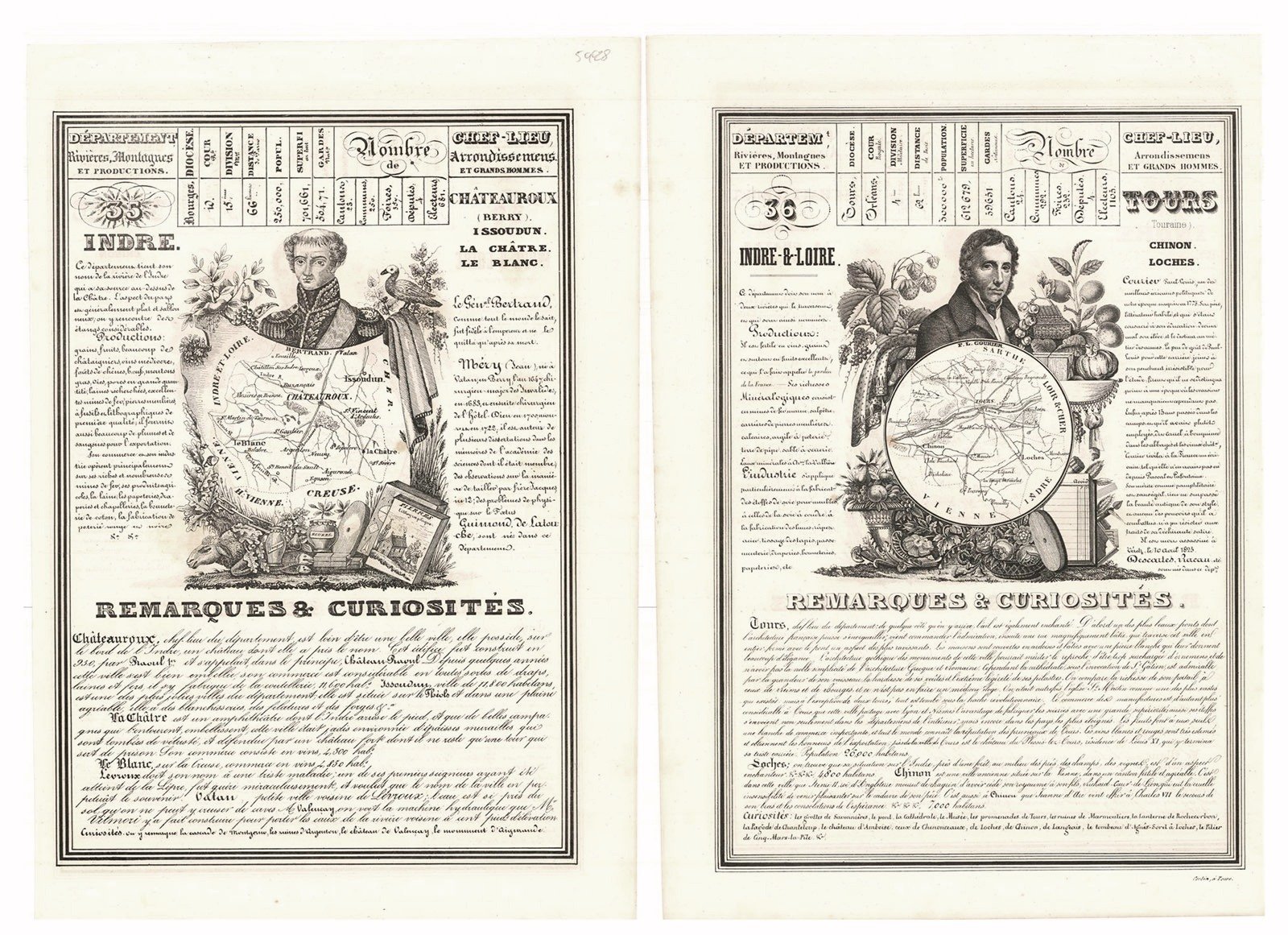Carta n°35 del Dipartimento di Indre inserita in un medaglione centrale sormontato da un ritratto del Generale Bertran. Questa è circondata da spiegazioni e osservazioni riguardanti l'economia, la geografia e la storia di quel territorio in cui si evidenziano le cittadine di Chateauroux (Berry), Issoudun, La Chatre, Le Blanc.Al retro la carta n° 36 del Dipartimento de Indre & Loire inserita in un medaglione centrale sormontato da un ritratto di Paul Louis Courier. Anche questo è circondato da spiegazioni e osservazioni riguardanti l'economia, la geografia e la storia di quel territorio in cui si evidenziano le cittadine di Tours (Touraine), Chinon, Loches.Inserita nell'opera "Nouvelle Géographie et Statistique de La France Alger et La Belgique, Suive d'un Traité sur le Mone entier. Ornée de 95 cartes approuvée de l'Université pa J. Henry, maitre de Pension" edita dall'Autore Alexandre Corbin Litografo ed editore a Tours nel 1842