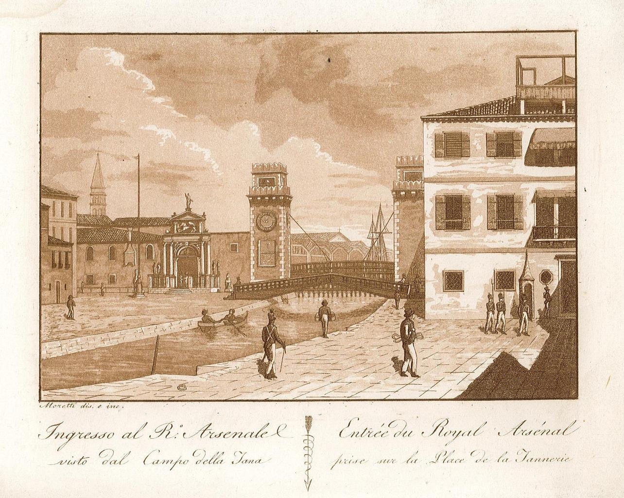 Ingresso al R.o Arsenale visto dal Campo della Tana - Il titolo si ripete in francese sulla destra