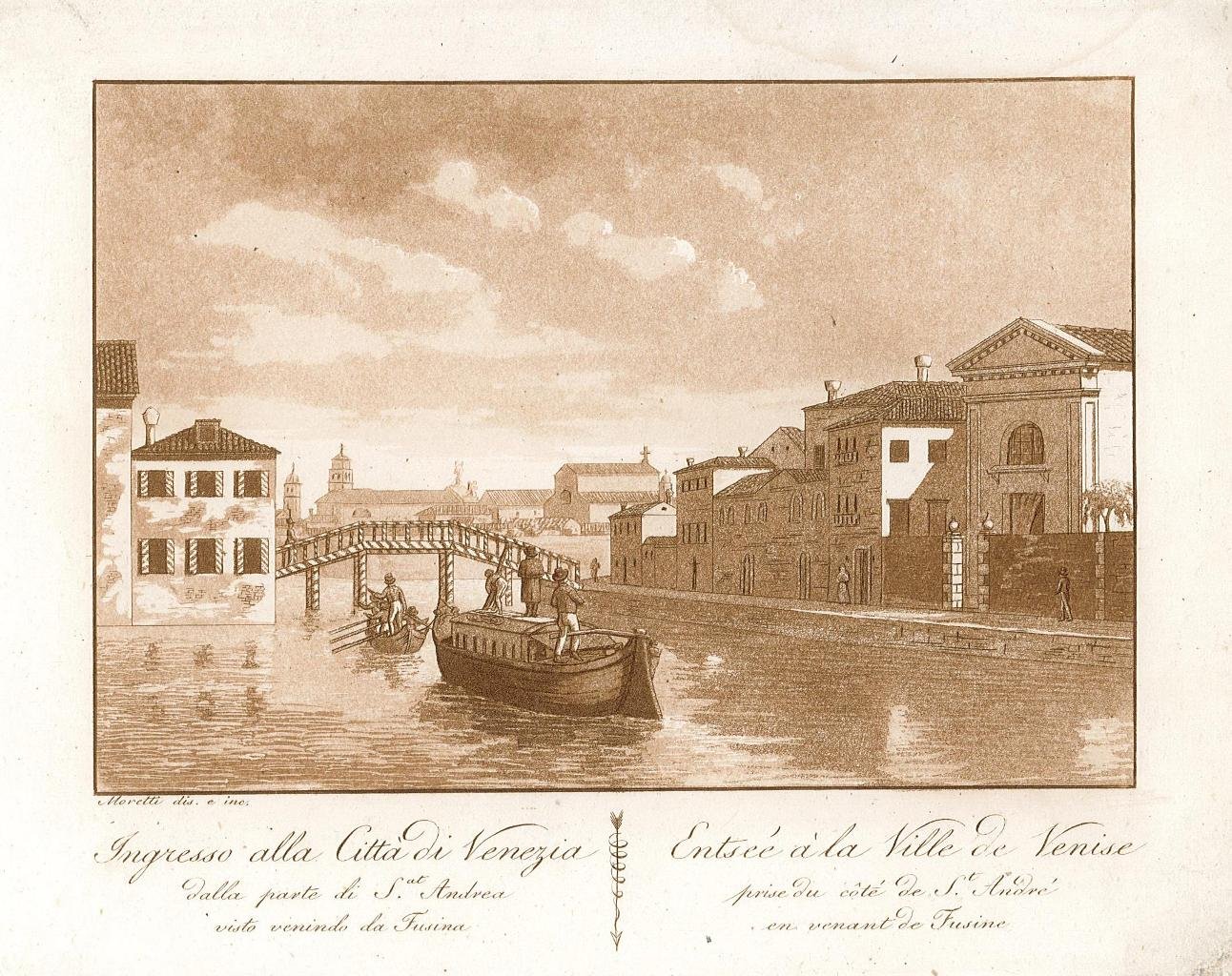 Ingresso alla Città di Venezia dalla parte di S.at Andrea visto venindo da Fusina - Il titolo si ripete in francese sulla destra