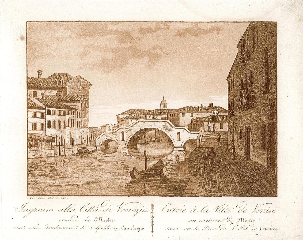 Ingresso alla Città di Venezia venindo da Mestre visto sula Fondamenta di S. Giobbe in Canalregio - Il titolo si ripete in francese sulla destra
