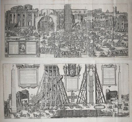 Acquaforte e bulino, circa 1586, monogrammate in lastra. Da un disegno di Giovanni Guerra. Bellissima prove, incisa su carta vergata coeva, in ottimo stato di conservazione. Tiratura del XVII secolo, con il bordo decorato ridotto.Per la sistemazione di Piazza San Pietro, il neo eletto papa Sisto V commissionò i lavori all’architetto svizzero Domenico Fontana, nel 1585. Per l’abbellimento della piazza venne trasportato da un altro sito della città, un obelisco egizio. L’opera, di alta ingegneria per l’epoca, produsse un grande interesse, culminato dalla pubblicazione dello stesso Fontana del 1590, il celebre Della trasportatione dell'obelisco Vaticano et delle fabriche di Nostro Signore Papa Sisto V, fatte dal caualier Domenico Fontana architetto di Sua Santita.Le incisioni contenute nel libro, raffiguranti il lavori, furono affidate a Natale Bonifacio. Sebbene le illustrazioni per il libro del Fontana furono pubblicate solo nel 1590, il Bonifacio fu coinvolto nell’evento ben prima; nell’agosto del 1586 infatti egli eseguì le due grandi lastre che descrivevano le operazioni di trasporto ed innalzamento, da disegni di Giovanni Guerra (1540-1618). Queste opere furono edite come lavori indipendenti, probabilmente come souvenir del grande evento. In seguito sono ristampate ed incluse nel Theatrum Italiae di Johannes Blaeu. Etching and engraving, 1586 circa, signed with monogram on plate. After a drawing of Giovanni Guerra. Beautiful work, printed on contemporary laid paper, minor paper tears perfectly repaired, otherwise in excellent condition. When St. Peter’s square was reorganized, the newly elected pope Sixtus V commissioned the job to the Swiss architect Domenico Fontana, in 1585. To decorate the square, an Egyptian obelisk was taken from another square in town. This fact was considered to be extremely in the van for the time and it arose great interest in the public which led to the publication, by Fontana himself, of the famous Della trasportatione dell'obelisco Vaticano et delle fabriche di Nostro Signore Papa Sisto V, fatte dal caualier Domenico Fontana architetto di Sua Santita, in 1590. Natale Bonifacio was commissioned the engravings of the book which depicted the works. Though the illustrations of Fontana’s book were published only in 1590, Bonifacio was involved in their preparation. In August 1586 he actually realized two big plates depicting the transportation and the rising of the obelisk, after some drawings of Giovanni Guerra (1540-1618). These plates were published as independent works, probably as souvenir of the great event and afterwards reissued and included in Johannes Blaeu’s Theatrum Italiae. Cfr. Bury, The Print in Italy, pp. 101/104; Reed & Wallace, Italian etchers of the Renaissance & barocque p. 85/88.