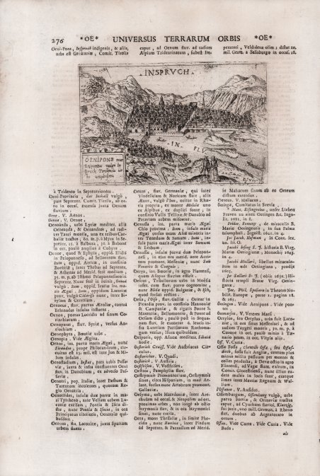 Veduta pubblicata per la prima volta nella serie ' La Raccolta di le piu illustri et famose citta di tutto il mondo, edita da Francesco Valegio a Venezia verso la fine del ’500, che comprende circa 322 piante e vedute delle principali città del mondo conosciuto. Di questo volume, si conservano diversi esemplari, tutti con numero variabile di incisioni e privi di un indice a stampa. Inoltre, gran parte delle tavole contenute nella raccolta del Valegio furono inserite nella ' Nuova raccolta di tutte le più illustri et famose città di tutto il mondo, curata da Donato Rasciotti, edita alla fine del sedicesimo secolo. Tuttavia, è persino incerto quale delle due raccolte venne per prima alla luce ed ignote sono le datazioni di tutte le tirature conosciute. Francesco Valegio nasce a Bologna circa nel 1560, anche se alcuni studiosi gli accreditano un’origine veronese; la sua attività di incisore ed editore calcografo si svolge tutta a Venezia, spesso in associazione con altri stampatori. Le tavole che compaiono nelle ' Raccolta, che senza dubbio possiamo considerare come la sua opera più importante, sono tutte prive di data, ad eccezione di quelle di Algeri, Costantinopoli e Rodi, firmate da Martino Rota, datate 1572. Le piante e le vedute firmate dal Rota, incisore nativo di Sebenico e attivo a Venezia fino al 1573, costituiscono, senza dubbio, il nucleo più antico dell’opera e fanno ritenere che questa sia stata un progetto editoriale iniziato proprio dall’incisore dalmata. In un primo momento, la presenza di queste tavole aveva portato a datare l’opera al 1579, data che sembra tuttavia molto improbabile. Molte delle immagini riprendono modelli figurativi apparsi nei primi volumi del ' Civitates Orbis Terrarum, editi tra il 1572 ed il 1588 (e successivamente ristampati sino al 1617) dai cartografi Georg Braun e Franz Hogenberg. Pertanto, è molto più plausibile che il Valegio iniziò verso il 1580 ad osservare le tavole incise da Martino Rota, per poi ampliare e pubblicare la raccolta, nell’ultimo ventennio del secolo. Dell’intero corpus di incisioni che compongono l’opera, 112 recano la firma o la sigla del Valegio, altrettante sono assimilabili alla mano dello stesso, mentre 69 sono ascrivibili ad altro artista, non identificato. Questo esemplare è tratto dall'opera ' Universus terrarum orbis scriptorum calamo delineatus . qui de Europae, Asiae, Africae, & Americae regnis, provinciis, populis, civitatibus. pubblicata a Padova nel 1713, presso Matteo Cadorin, da Raffaello Savonarola, sotto lo pseudonimo di Lasor a Varea (o Varela). L'opera era una sorta di enciclopedia che conteneva notizie sulle varie località del mondo disposte in ordine alfabetico, arricchita da mappe e vedute di tutto il mondo che appartengono a celebri raccolte cartografiche del passato – Bertelli, Valegio, Camocio, Bonifacio, Nelli, Magini e altri – del quale probabilmente l’editore Cadorin era in possesso delle matrici originali. Incisione su rame, ampi margini, in ottimo stato di conservazione. La Raccolta di le piu illustri et famose citta di tutto il mondo, published by Francesco Valegio in Venice towards the end of the XVI century, containing about 322 plans and views of the main cities of the World. There are different examples of this work, every one with a different number of plates and without an index. Many of these plates have been afterwards included in Donato Rasciotti's ' Nuova raccolta di tutte le più illustri et famose città di tutto il mondo, ' printed at the end of the XVI century. It is still, however, quite unclear whether Valegio or Rasciotti published first his collection. Francesco Valegio was born in Bologna around 1560, even though some say he might have been born in Verona; as engraver and calcographer, he worked in Venice, very often in association with other publishers. The plates of his series, which can be considered his most important work, do not bear any date, except for those of Algeri, Costantinopoli and Rodi, signed by Martino Rota, dated 1572. The city plans signed by Rota, (engraver born in Sebenico who worked in Venice until 1573), are the most ancient core of the work, which make us think that this work has been planned by Rota himself. Many plates recall the figurative models of the ' Civitates Orbis Terrarum ' printed between 1572 and 1588 (afterwards reissued until 1617) by Georg Braun and Franz Hogenberg. It is possible that Valegio started to select the plates by Rota around 1580 and afterwards enlarged his collection at the end of the century. 112 plates bear Valegio's signature or monogram and as many can be ascribed to him; 69 have been ascribed to an unkwown artist. The collection was extremely successful and became the base for the following copies. ' This example is taken from the work ' Universus terrarum orbis scriptorum calamo delineatus . qui de Europae, Asiae, Africae, & Americae regnis, provinciis, populis, civitatibus. ' published in Padua in 1713, at Matteo Cadorin, by Raffaello Savonarola, under the pseudonym of Lasor a Varea (or Varela). The work was a kind of encyclopedia containing news about the various localities of the world arranged in alphabetical order, enriched with maps and views of the whole world belonging to famous cartographic collections of the past-Bertelli, Valegio, Camocio, Bonifacio, Nelli, Magini, and others-of which the publisher Cadorin probably possessed the original plates. Copper engraving, in excellent condition. ' Very rare. Cfr.