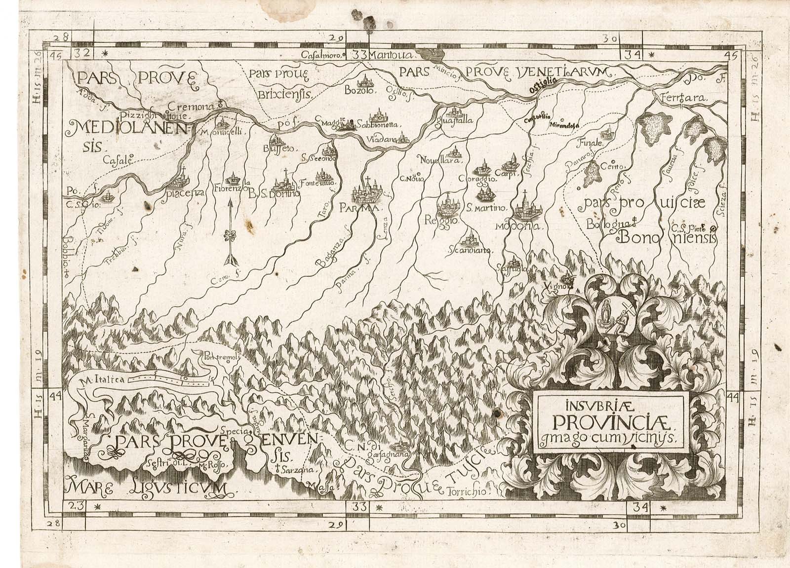 Raffigurazione del territorio emiliano e regioni confinanti. La carta è corredata da un foglio in cui sono riportati alcuni dati riferiti alla regione raffigurata. Per questa edizione della "Chorographica descriptio provinciarum et conventuum.S. Francisci Capucinorum.", curata dal ministro provinciale di Milano Giovanni Battista da Cassine su espressa richiesta del Ministro Generale Agostino da Latisana, le tavole furono nuovamente incise con un disegno generale e coordinate geografiche del tutto differenti dalle precedenti edizioni. Gli incisori delle carte di questa edizione sono Simone Durello ed il Padre Cappuccino Michelangelo de Dinant. Inserita nell'opera "Chorographica descriptio Provinciarum. et Conventuum FF. Min. S. Francisci Capucinorum." edita a Milano 1712