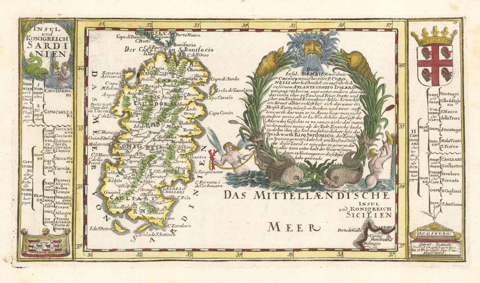 Carta geografica dell'isola di Sardegna, che come dichiarato nel ricco cartiglio di destra, ripropone il modello del Coronelli. Nell'angolo in basso a destra si trova l'indicazione delle scale grafiche riportate su decorativo drappo. La carta è caratterizzata da vivece coloritura coeva all'acquerello. Ottimo lo stato di conservazione