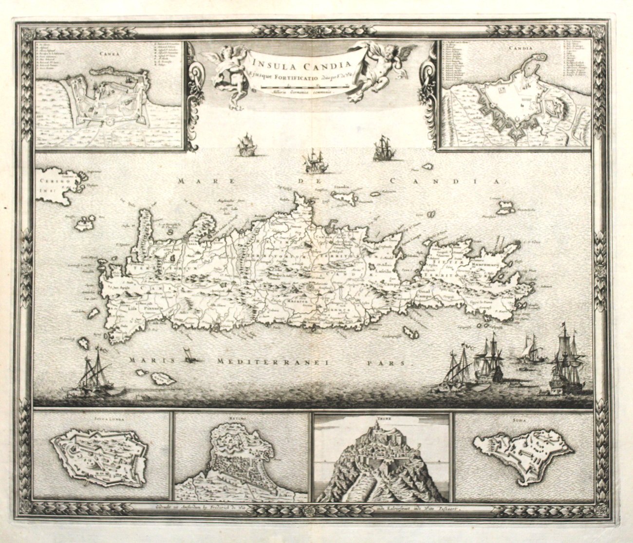 Incisione in rame, mm 470x555, firmata in basso nella cornice "Gedruckt tot Amsterdam by Frederick de Wit inde Kalverstraat inde Witte Paskaert ". Elegante cartiglio figurato al centro. Due riquadri in alto e quattro in basso raffiguranti fortezze e città dell'isola: Canea, Candia, Spina Longa, Retimno, Thine e Suda. La carta si basa su quella di Sebastien de Pontault de Beaulieu, che qualche anno prima eseguì numerosei disegni di fortezze del mediterraneo. Tratta da "Atlas sive Descriptio Terrarum Orbis". De Wit fu uno dei più noti cartografi della seconda metà del '600; acquistò molte lastre da Blaeu e Jansonius, producendo molti atlanti. Splendido esemplare in ottimo stato di conservazione eccettuata una traccia di tarlo nei margini laterali. <BR>Map of Crete with six insets showing the fortifications of Canea, Candia Spina Longa, Retimo, Thine and Suda. Based on the cartography of Sebastien de Pontault de Beaulieu, who mapped a lot of Mediterranean fortifications approx. anno 1674. On the map a lot of informations of roads, towns and topography.<BR><BR>Copper engraving, mm 470x555. Six insets with plans of Canea/ Chania, Candia/Iralkion, Spina Longa, Retimo, Thine and Suda. decorative banner title held by two cherubs at top and nice bordure. It is based on the cartography of Sebastien de Pontault de Beaulieu, who mapped a lot of Mediterranean fortifications approx. anno 1674. Dark Impression, very good conditio except some minor worming in outer margins. From "Atlas sive Descriptio Terrarum Orbis".<BR>De Wit was one of the most prominent and successful map engravers and publishers in Amsterdam in the period following the decline of the Blaeu and Jansson establishments, from which he acquired many copper plates when they were dispersed at auction.<BR>His output covered most aspects of map making: sea charts, world atlases, an atlas of the Netherlands, 'town books' covering plans of towns and cities in the Netherlands and Europe, and wall maps.<BR>Frederick de Wit was born in Gouda near Amsterdam in 1648 and by 1654 he had opened a printing office and shop under the name "De Drie Crabben" (the Three Crabs) which was also the name of his house on the Kalverstraat. In 1655, De Wit changed the name of his shop to the "Witte Pascaert" (the White Chart). Under this name De Wit and his firm became internationally known.<BR>Dating De Wit's atlases and maps is considered difficult because usually no dates were recorded on the maps and their dates of publication extended over many years<BR>Zacharakis:3714/2392. <BR>