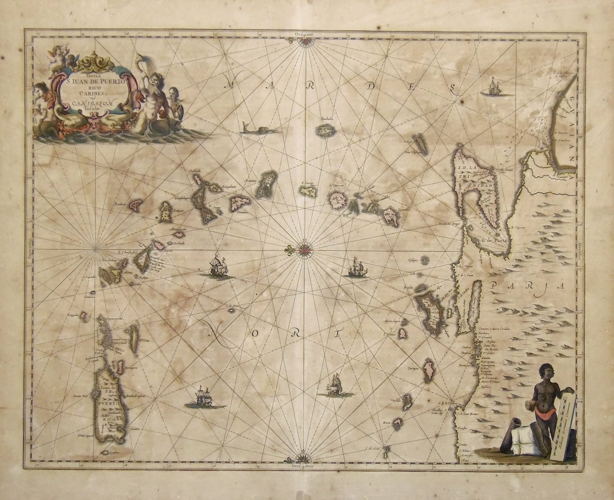 Incisione in rame, colorata d'epoca, 410x520. Carta delle piccole Antille. Janssonius fu in collaborazione con il cognato Henricus Hondius prima e successivamente dal 1638 da solo, il più importante concorrente dei Blaeu a cui ispirò ed uniformò la produzione, tanto da costringere Blaeu, anch'egli Jansson di cognome vero a scegliere uno pseudonimo per differenziare la propria produzione. Buon esemplare con evidente arrossamento della carta.